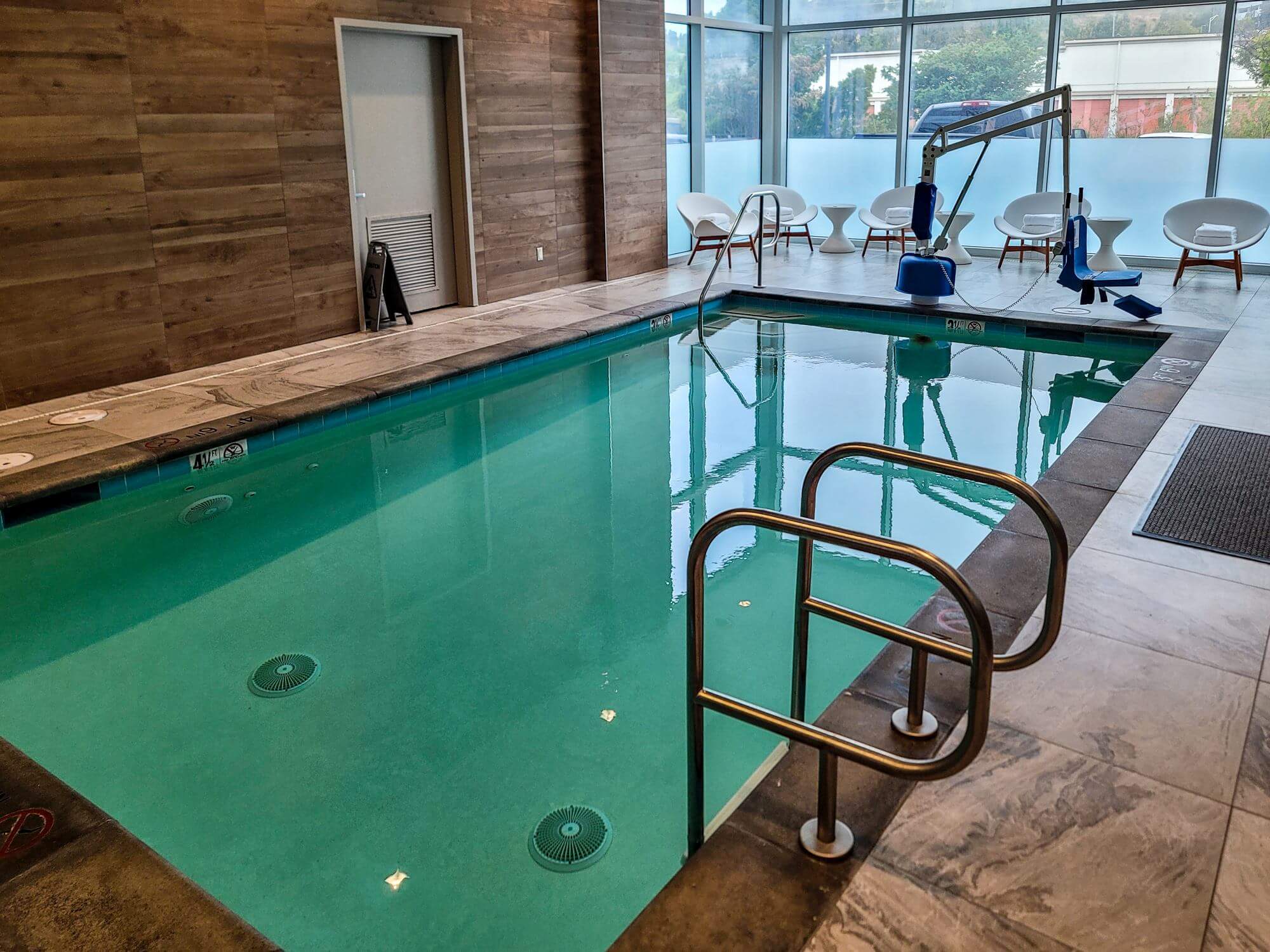 The indoor pool is located adjacent to the fitness center. It’s a very small pool in a very small room. There is very limited seating near the glass wall. The pool looks more like it was just stuffed in so you could claim a pool as amenity but its probably more for kids to play. There is no whirlpool in the pool area. There is a unisex restroom located between the pool area and fitness center.