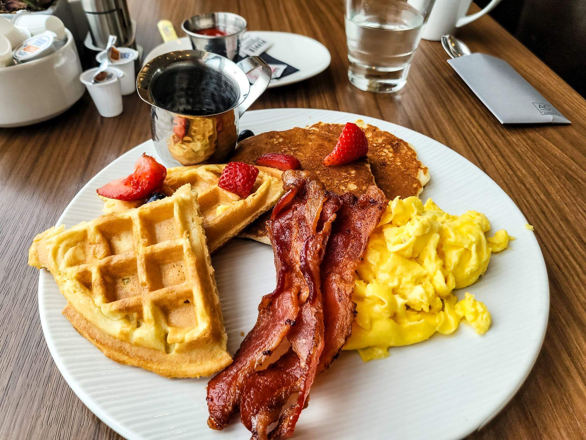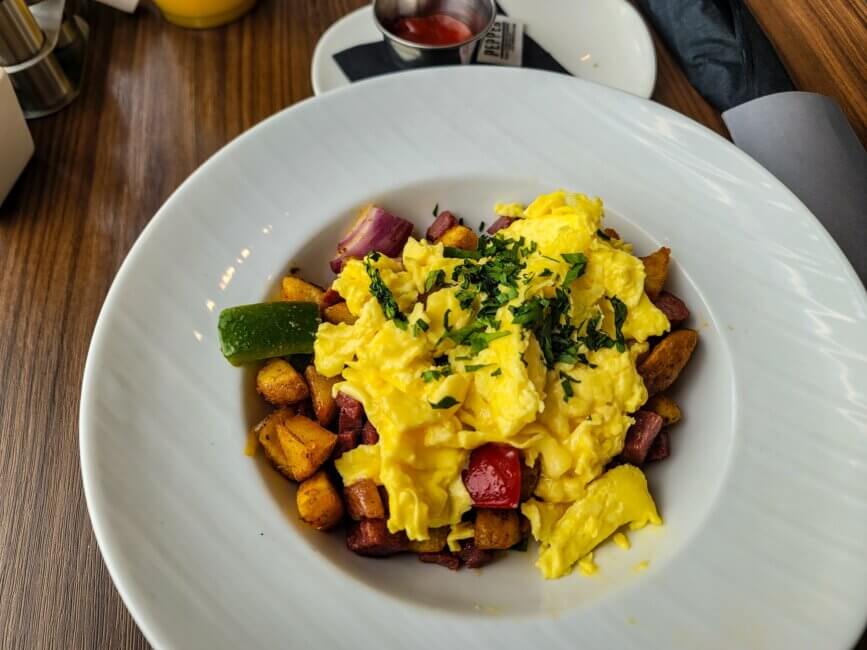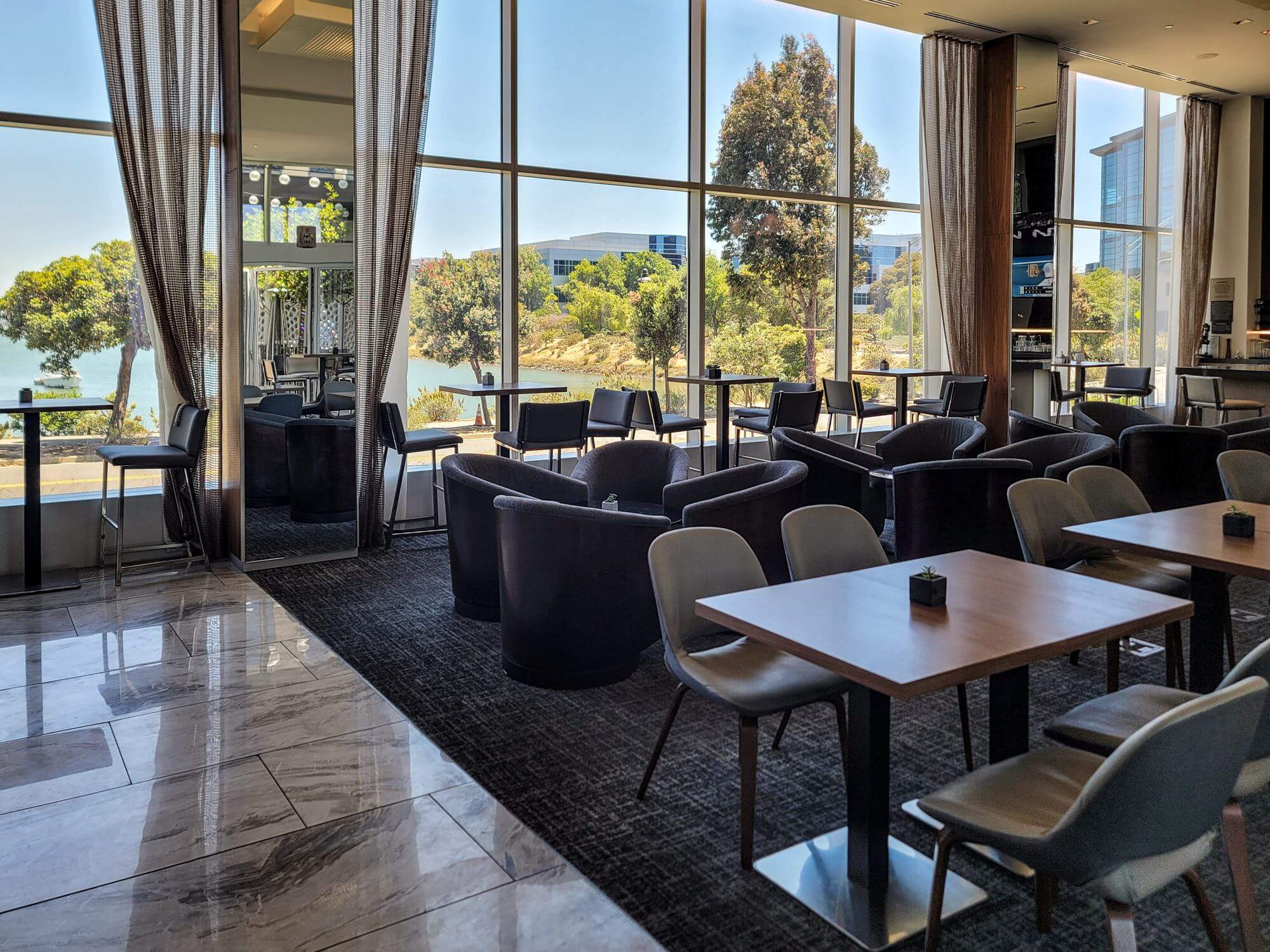 The AC Waterfront Lounge is the on-site restaurant at the AC Hotel San Francisco Airport/Oyster Point Waterfront. It serves breakfast, lunch and dinner. The restaurant takes up most of the lobby space and has lots of seating available. Even though the hotel was pretty full, I hardly saw anyone at the restaurant and was always able to pick my seat when dining.