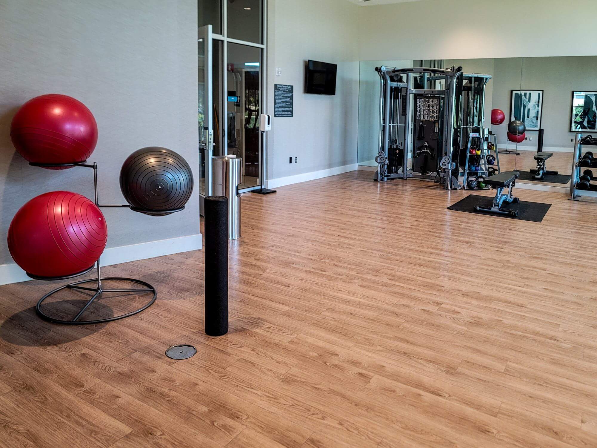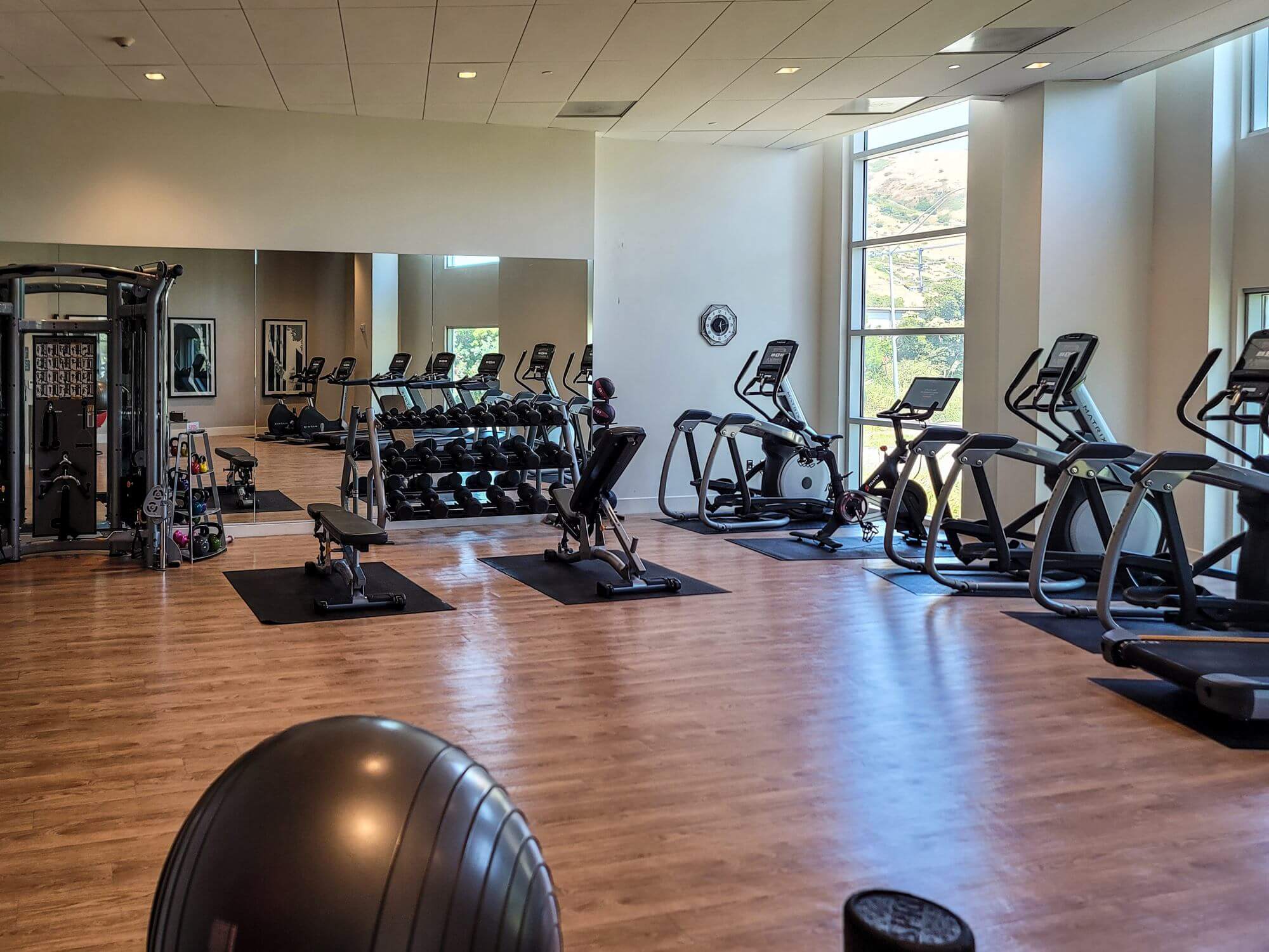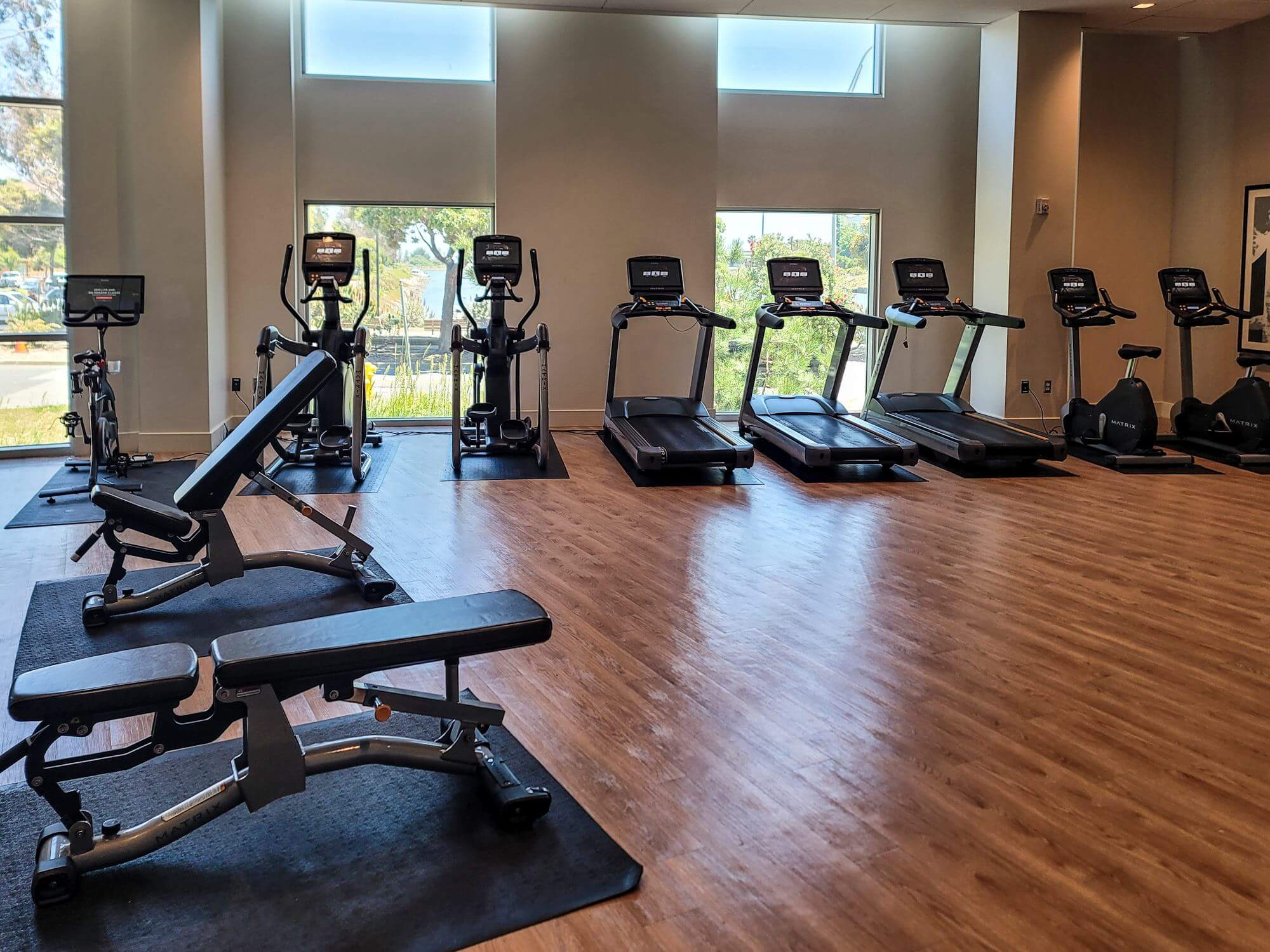 The fitness center is large and well-equipped. Plenty of workout equipment is available and the large windows offer a lot of light in the room.
