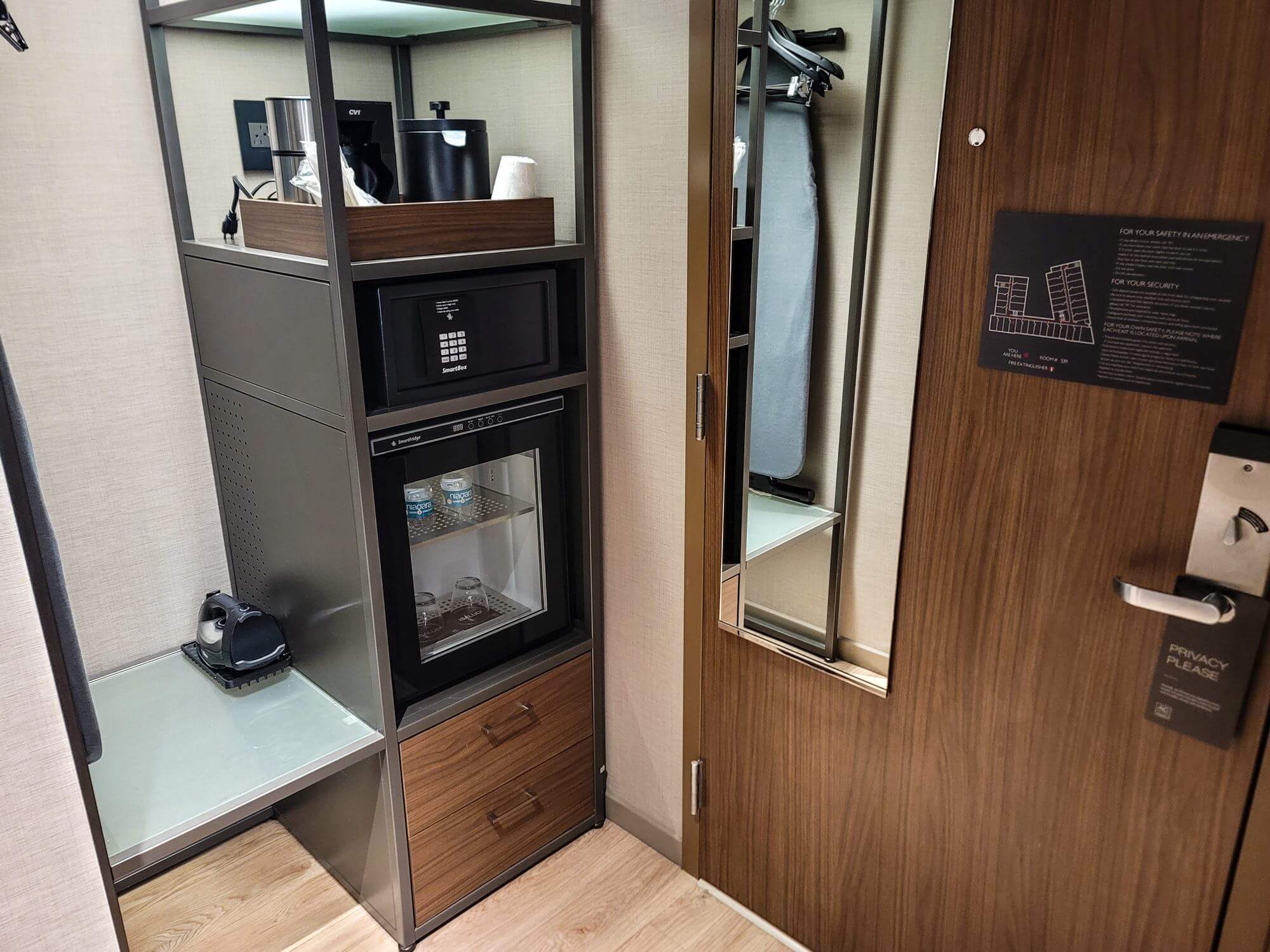 On the other side of the entryway, you have an open closet with hangers and some shelf space. The same closet also holds a safe, coffee maker and a small refrigerator.