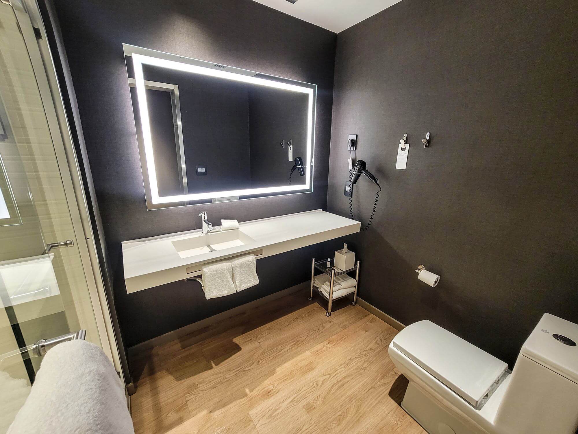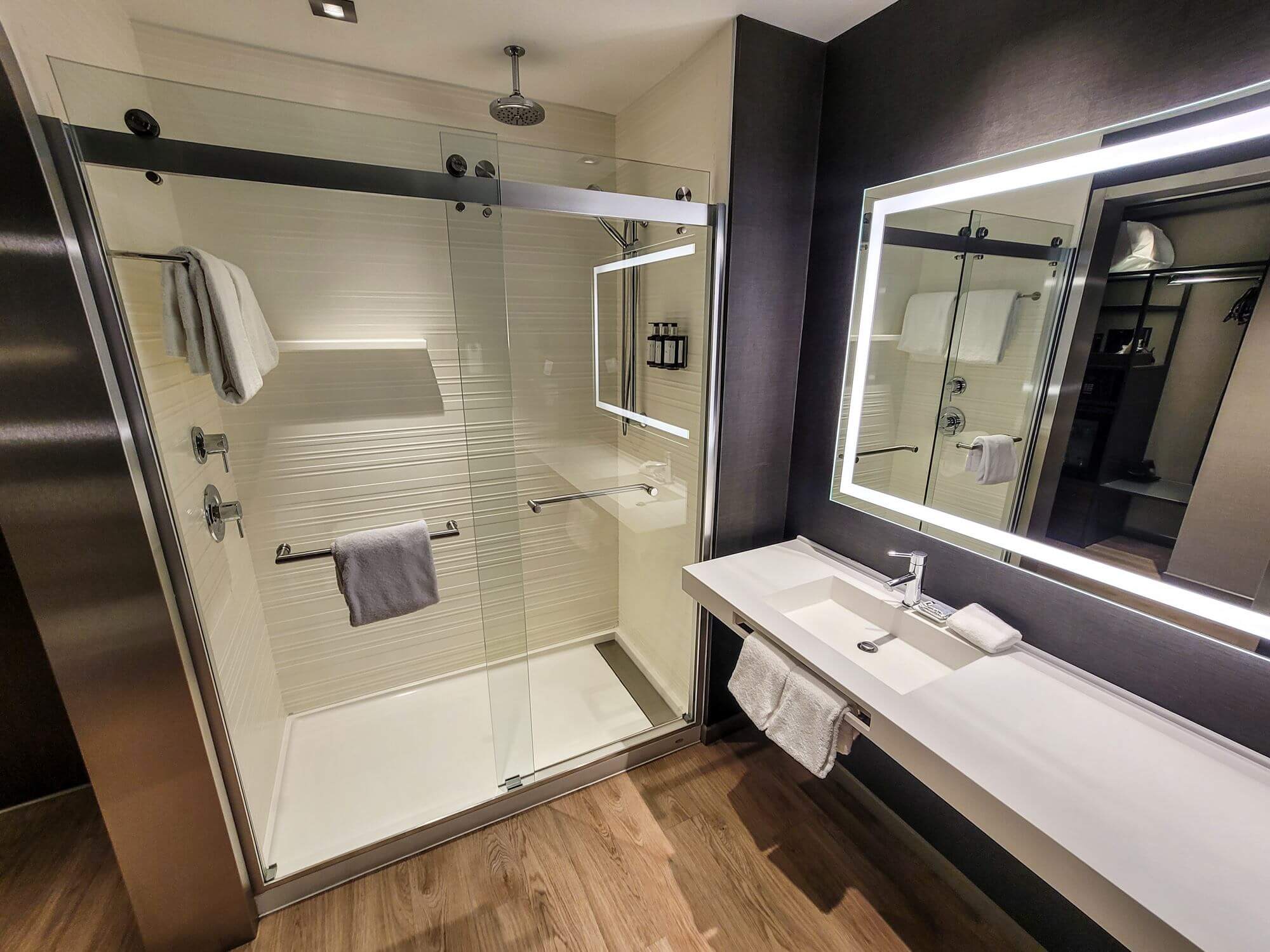 The bathroom is located at the beginning of the entryway. It comes with a walk-in shower which has a rain shower head as well as a shower wand. A vanity with a single sink and wall-mounted mirror takes up most of the wall space. The size of the bathroom is perfect. It is not too big or too small.