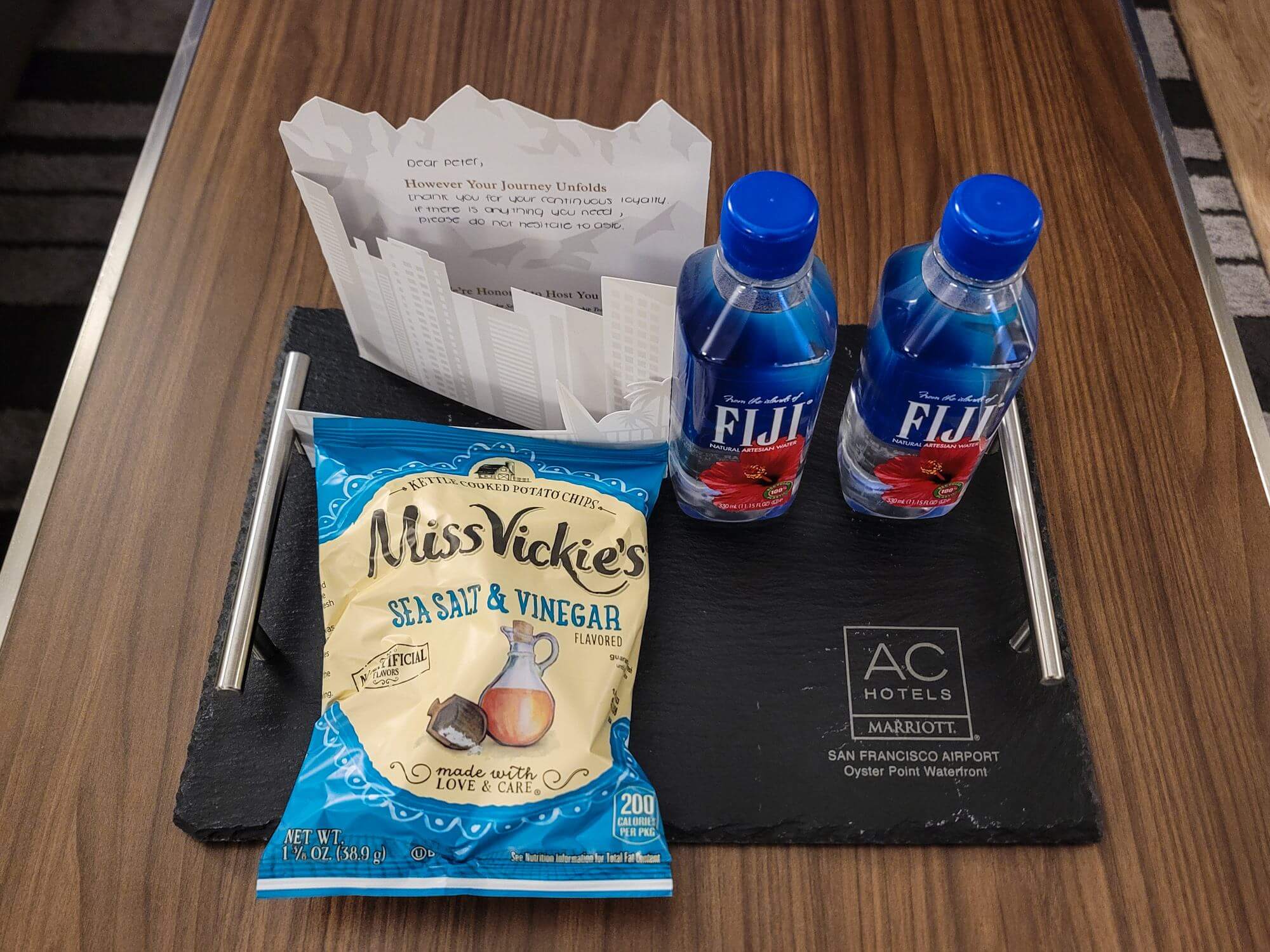 I had the choice between $10 food and beverage credit or points as my welcome amenity. Besides that, I received a small welcome gift bag with a pack of chips and a small bottle of water.