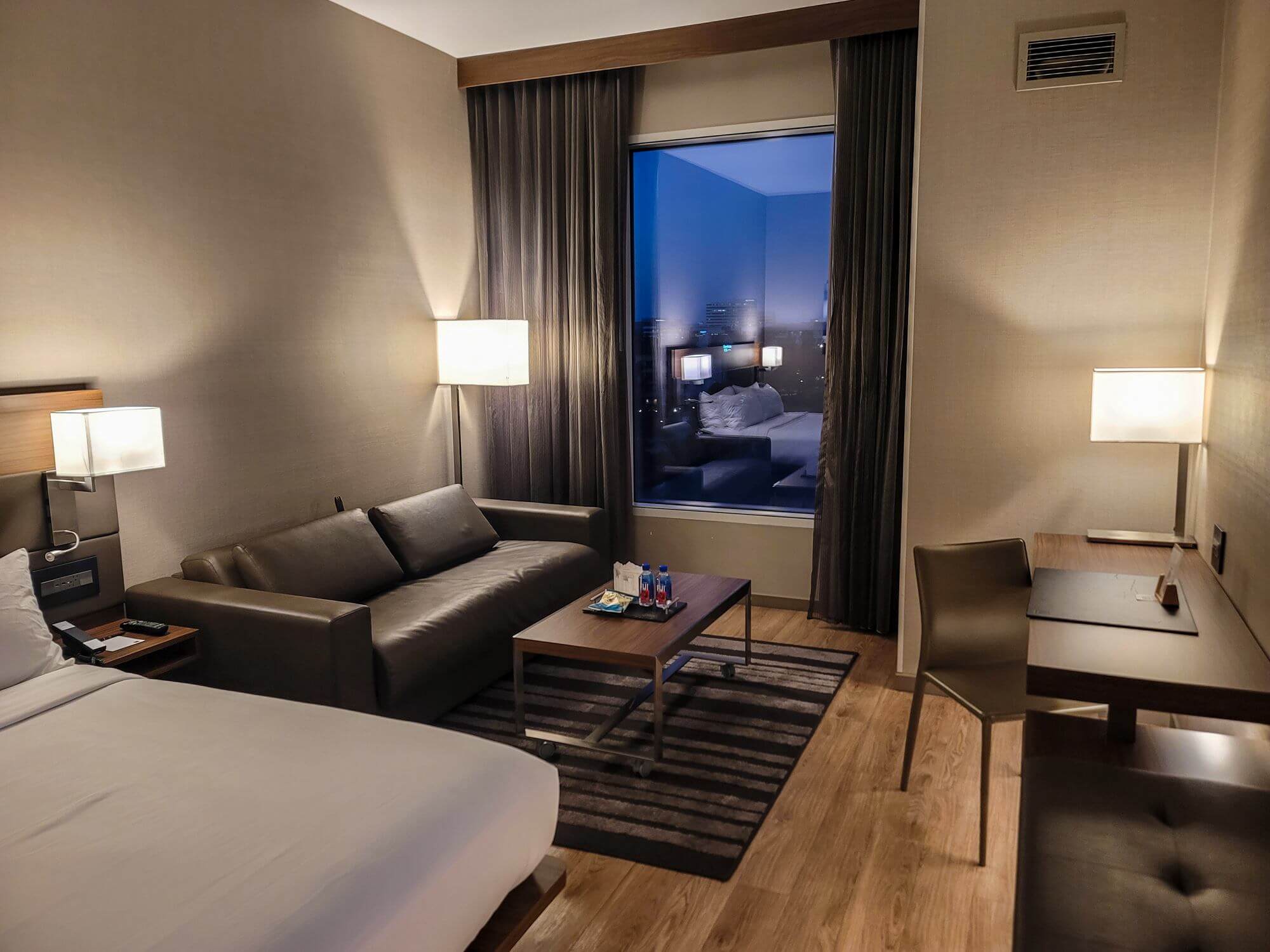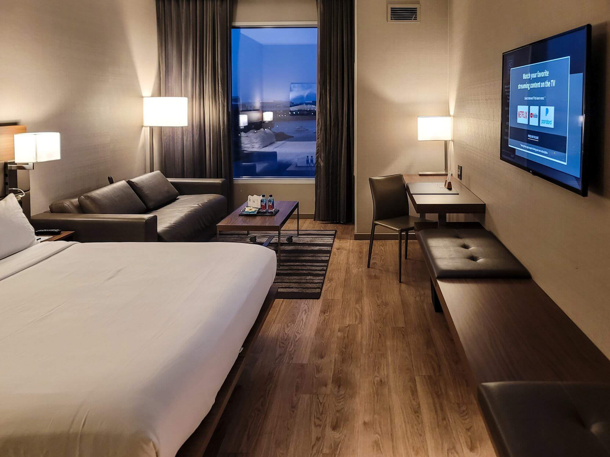 Next to the bed is a sofa bed and a cocktail table in front of it. The table has wheels, which makes it easy to move it out of the way to transform the sofa into a bed. When I arrived, I had a welcome gift on the cocktail table consisting of a package of chips, two small bottles of Fiji water and a greeting card.