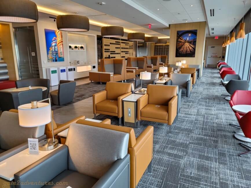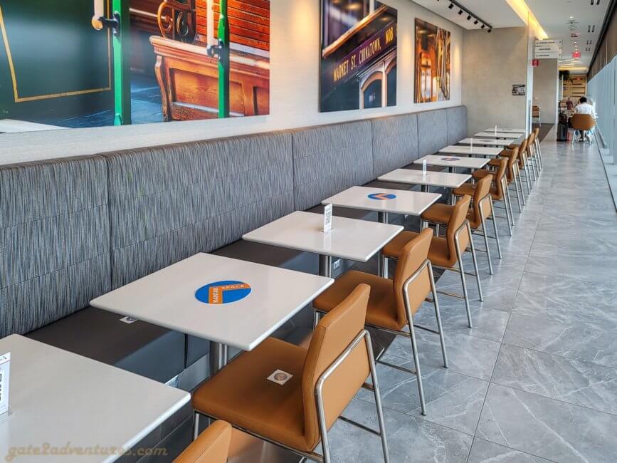 The new Admirals Club in Terminal 1 is 11,634 square feet and is 20% bigger than the former Admirals Club which was located in Terminal 2. At full capacity, it can seat 208 people, but because of the pandemic, it will operate at 50% capacity to allow for social distancing. During my visit on a Wednesday morning, there were only half a dozen guests in the lounge, including me.