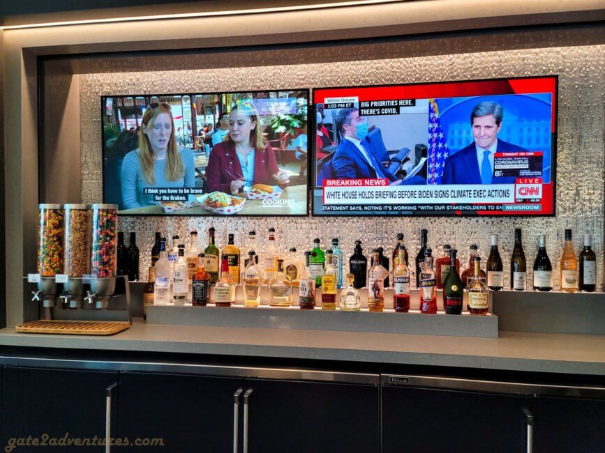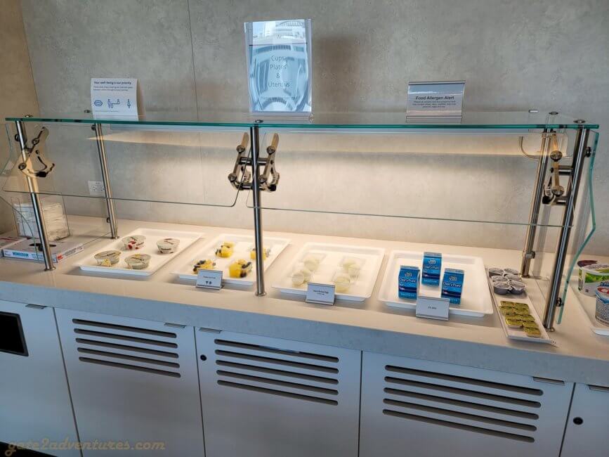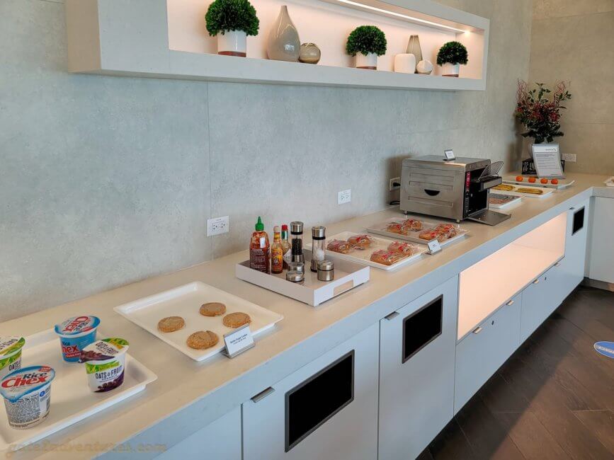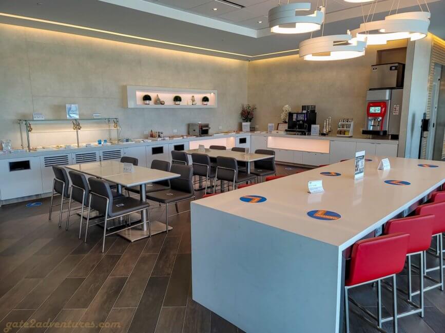 The right side of the lounge is geared towards the dining experience of the lounge. Most of the area is consumed by the bar and snack bar which also has a touchscreen coffee machine with antimicrobial protection and the soda dispenser, which lacks this protection. However, the staff is quick in cleaning and wiping down everything. Snacks, which include, toast, cookies, bagels, cheese, brownies, yogurt, and other goodies are all individually wrapped instead of the open-buffet-style you are used to from pre-pandemic times. Cups, plates, and utensils can be requested from the bar staff itself.