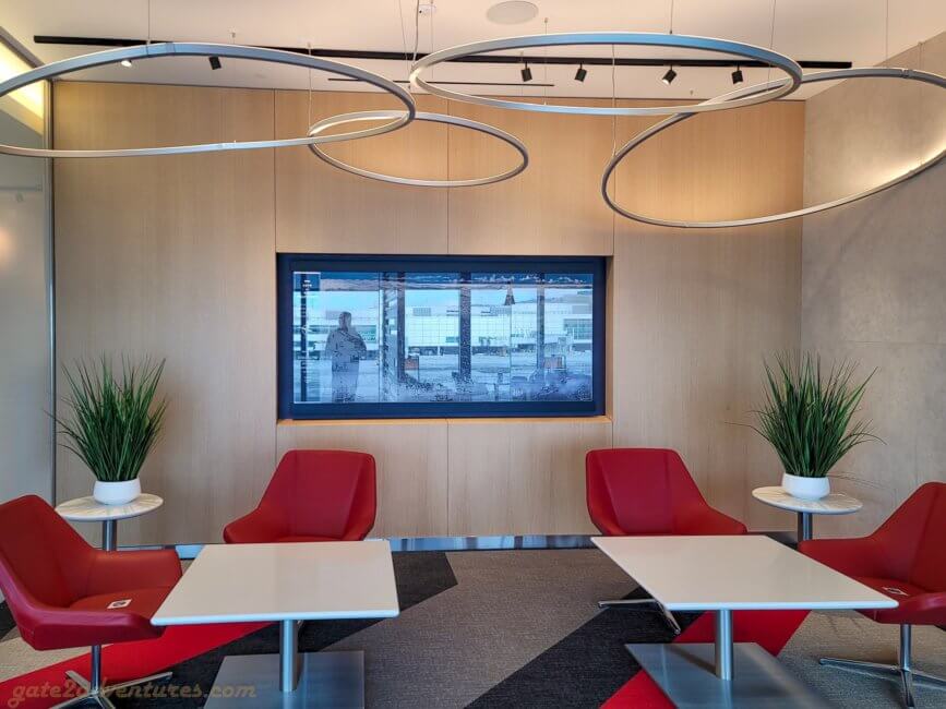 The left part of the lounge invites you to hang out and relax while you wait for your flight to board. Plenty of comfy chairs all over the place. There are four chaise longue chairs along the inside wall of the lounge to give you the ultimate relaxation experience.