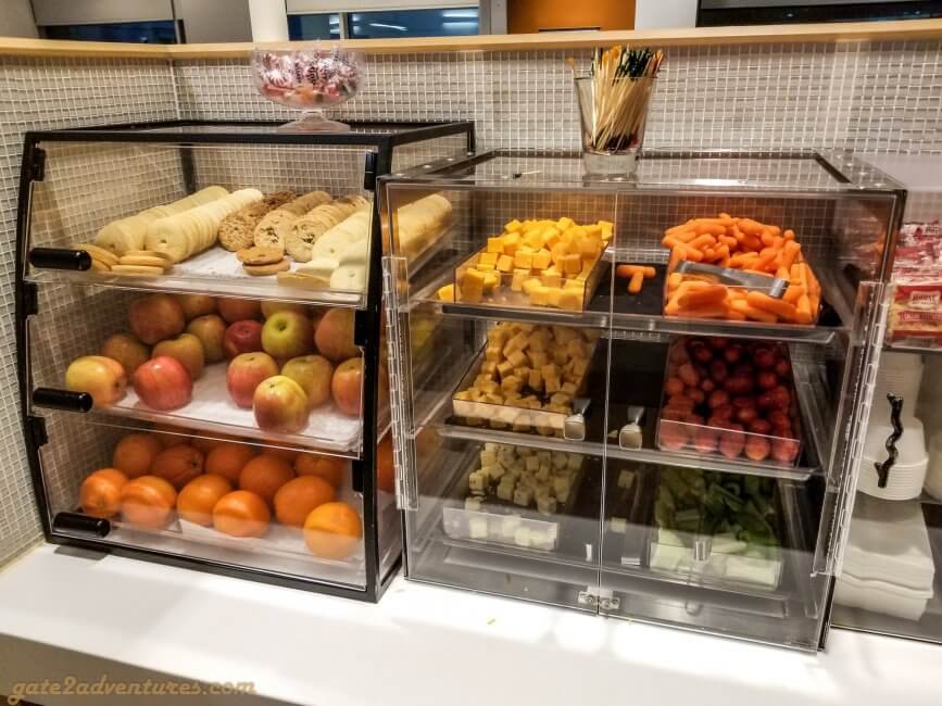 Besides the food menu, complimentary snacks are offered near the entrance. These are the usual lounge snacks: Fruits, different cheese cubes, carrots, and cookies. At the same snack buffet is also a coffee machine, water dispenser, and nuts.