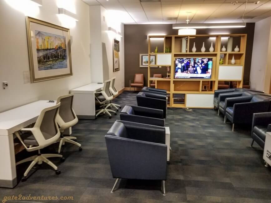 The rest of the lounge features different seating options, everything from a high top workstation with a printer, big comfy chairs and two office desks with two office chairs each. Every seat has access to a power outlet, even the chairs around the bar. Look around you, as the outlets are either between seats, under seats or on the table. Easy access to power is a huge plus.