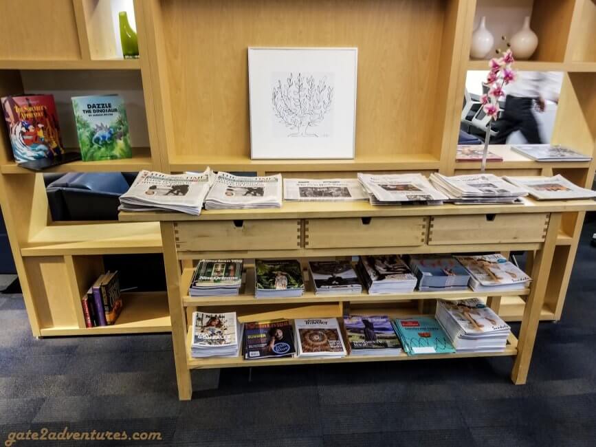 Multiple TV’s around the lounge keep you entertained with the latest news. In the farthest corner, to the left of the main entrance, is a huge selection of newspapers and magazines. There are also flight information displays and announcements for flights leaving Terminal 2. They announced the start of boarding for the British Airways flight but only one domestic flight which was in final boarding. Maybe they announce these flights just because they suspect the person to be in the lounge?