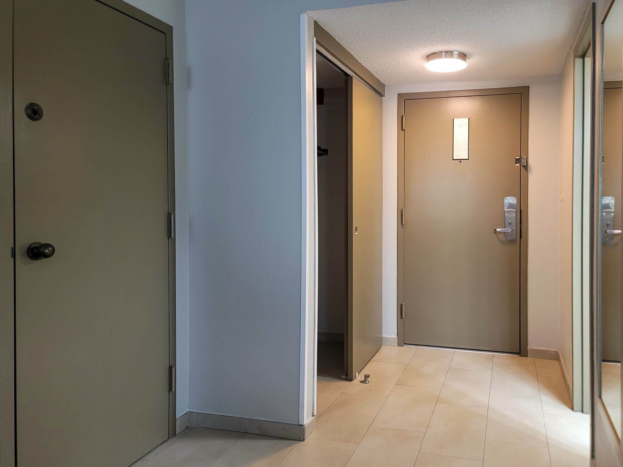 Right outside the bathroom is a full-size closet with sliding doors. Inside is an iron, an ironing board as well as some hangers for your cloth. Just next to the closet is the connecting room door, which will connect this room with the neighboring room. The entryway, all the way up to the connecting room door, and the bathroom has tiled floor while the main room is carpeted.