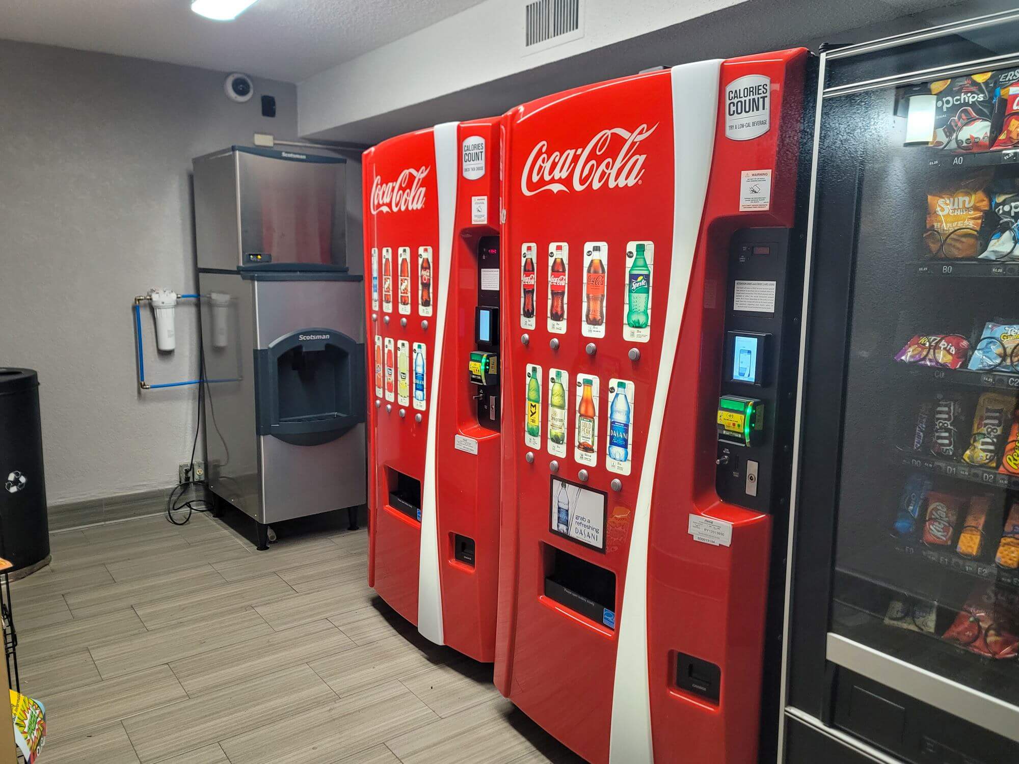 A room with vending machines is located in a small room on the backside of the building.