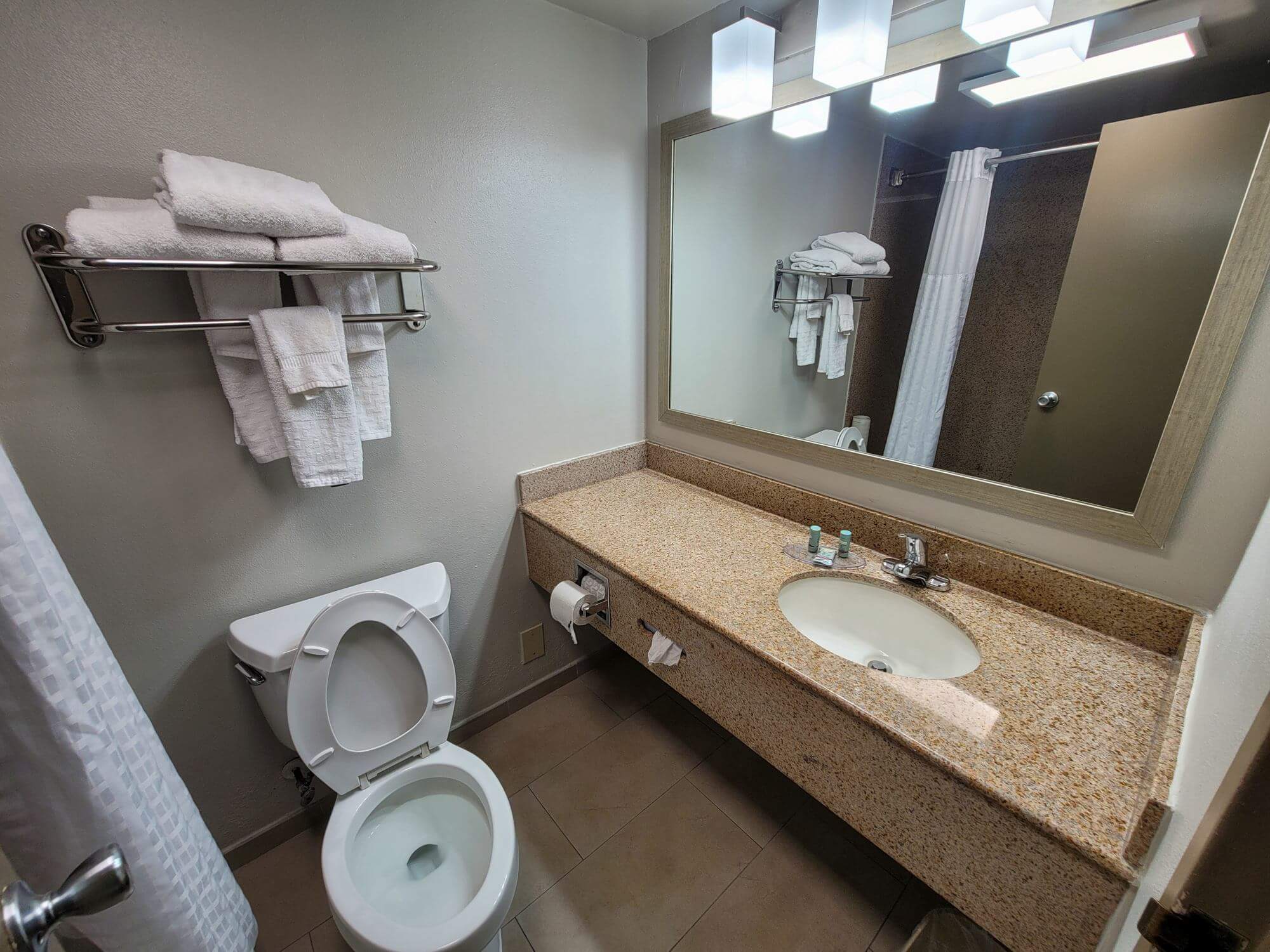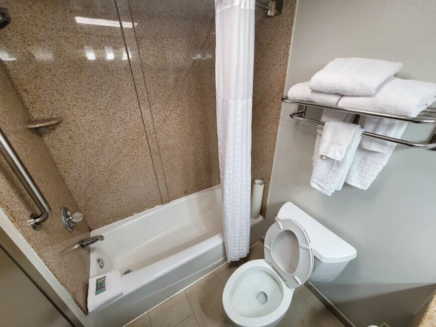 As you enter the room you have the bathroom to your left. It’s well-sized and comes with a vanity with a single sink and a large wall-mounted mirror. The other half of the bathroom consists of a tub/shower combo unit. There is no soap dispenser in the shower. The hotel provides single-use plastic bottles which sit on the vanity. A small shelf at the end of the room holds the towels.