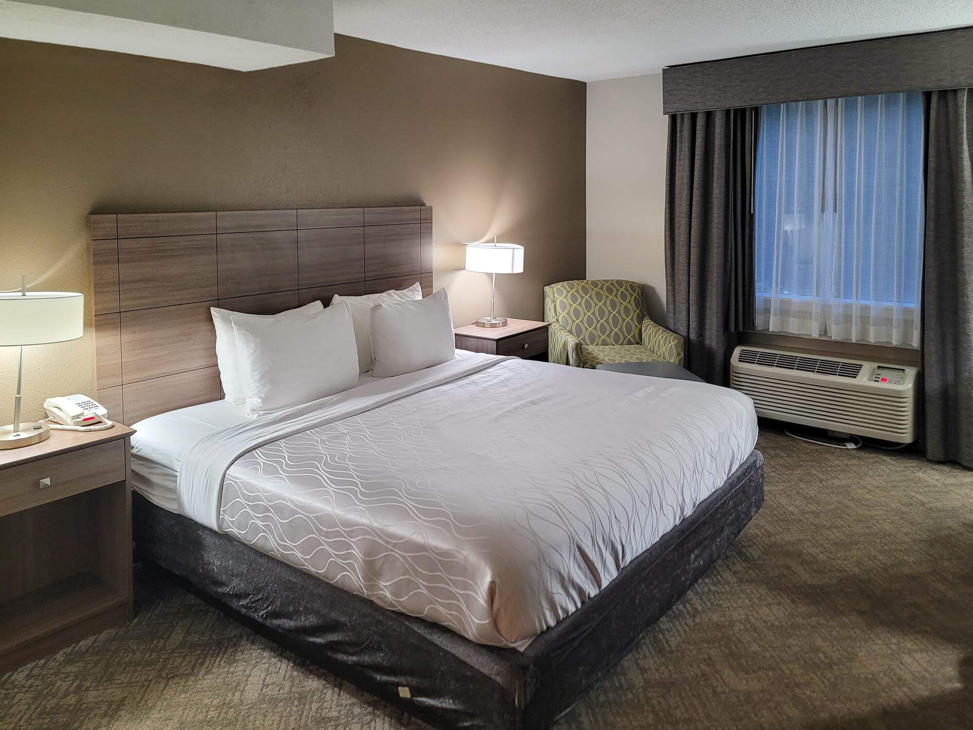 The room itself is very basic. The main part of the room is the King Bed which sits on the left side of the room. On either side of the bed is a nightstand with a lamp. The base of one of the lamps was very badly corroded. Next to the bed, in the outside corner of the room, is a chair.