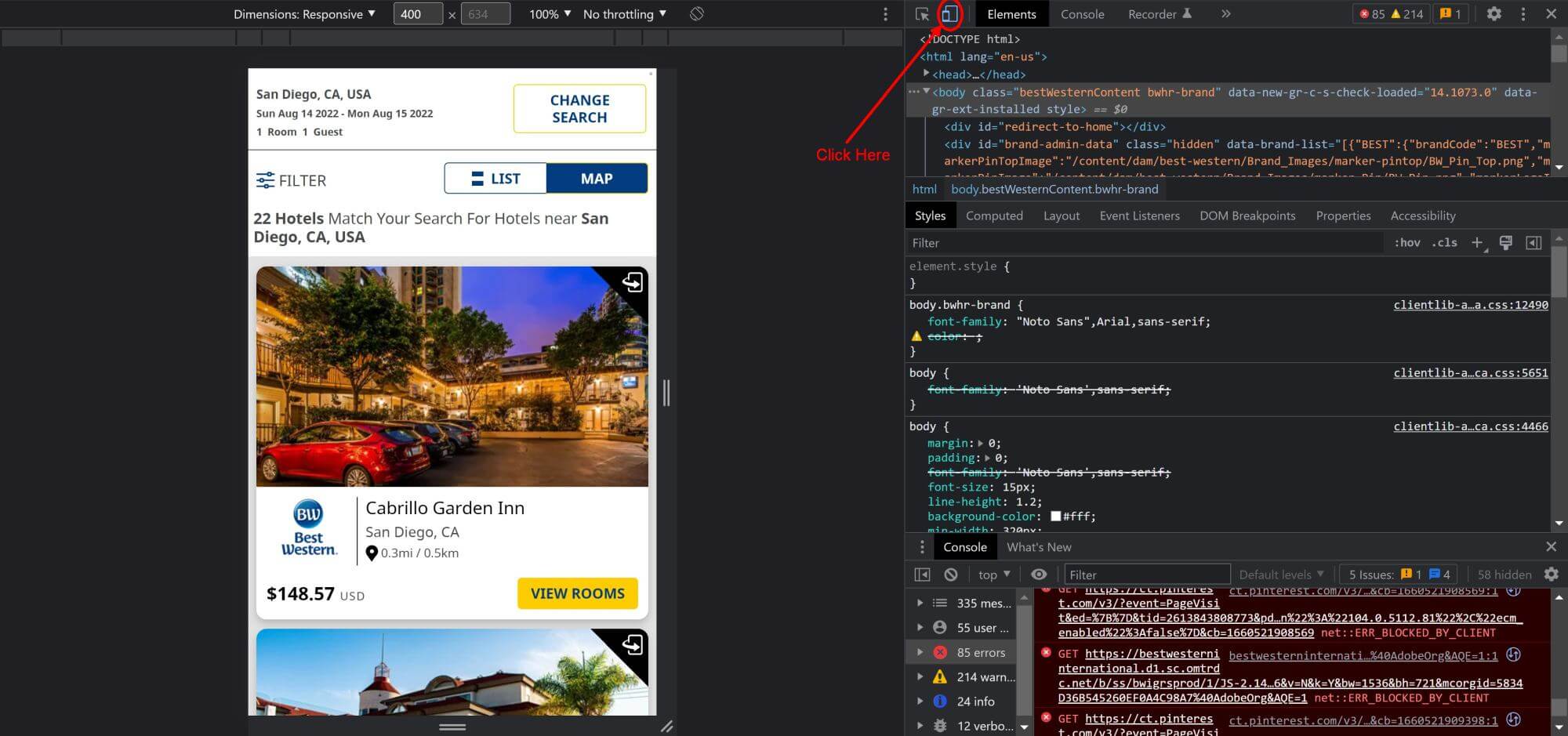 After further research, I found that the threshold value, where the map gets hidden, is a width of 767px. Is the width of the screen 767px or less, there won’t be a map. Everything above can see the map. It kinda has to be, in the bad way how they implemented the map. However, instead of showing it side by side, mobile views tend to re-order stuff from top to bottom. So for example Best Western could move the map to the very top of the screen when clicking on the map button. However, the rather decided to make the button useless on small screens.