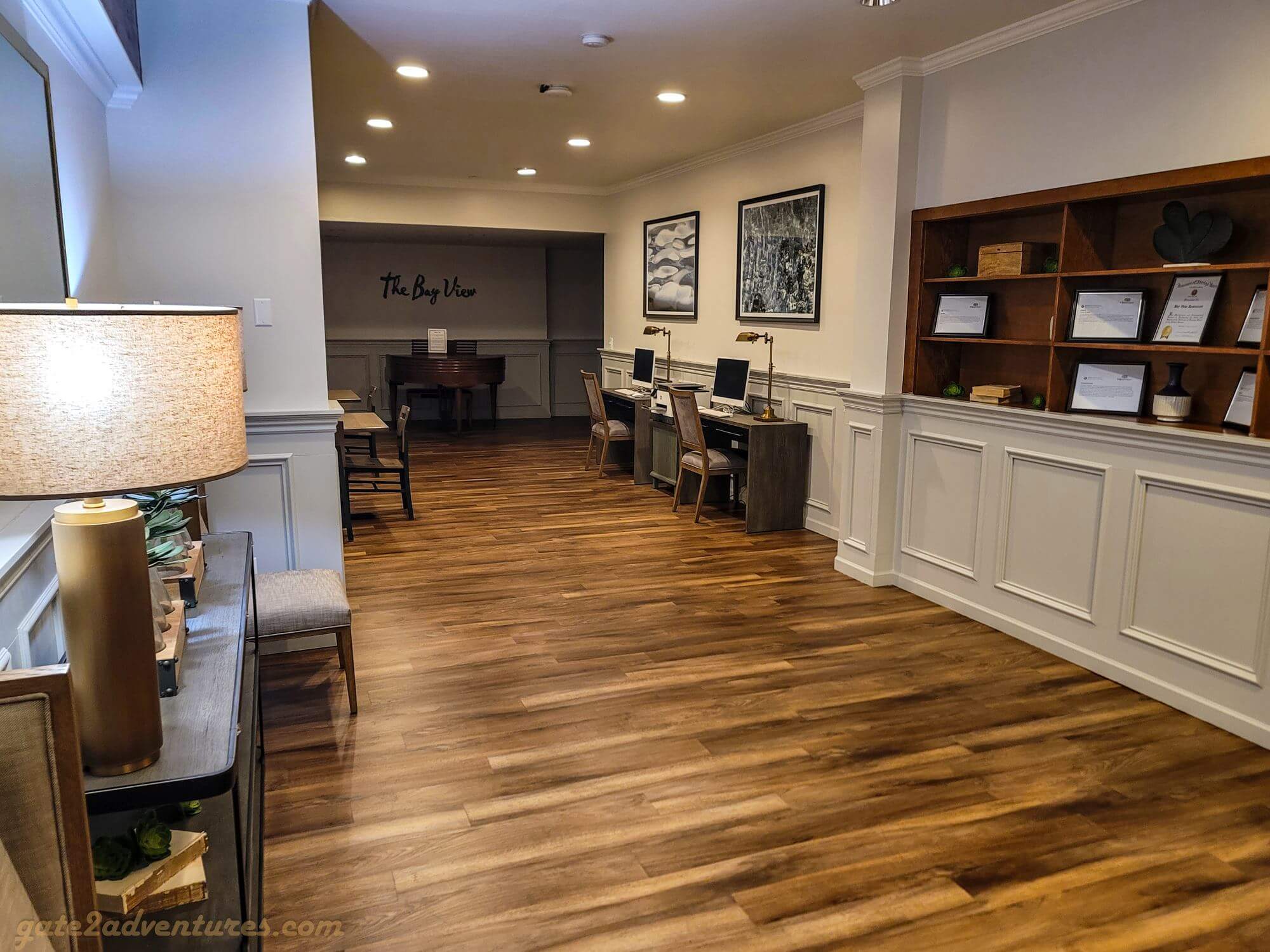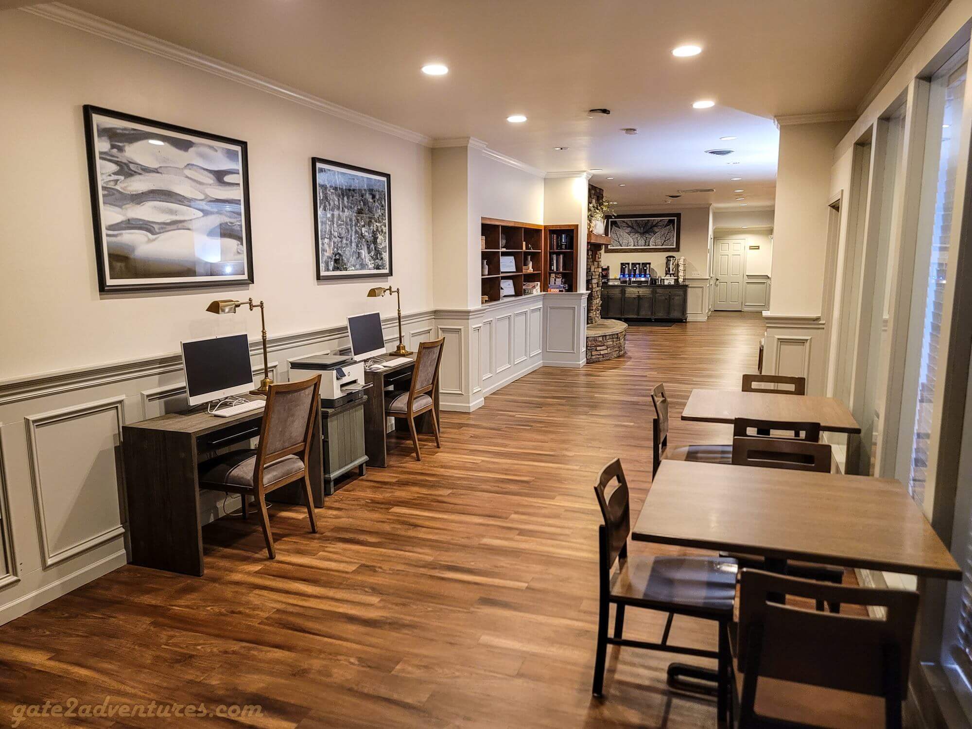 The lobby doesn’t offer much in regards for “activities”. It mainly holds the front desk, business center and the dining area for breakfast. It also connects you to a small ballroom next to the dining area. To get into the lobby, you have to walk up a small set of stairs or you can use the ramp to the left of the main entrance. The front desk is to your right as you walk in from the main entrance. Next to the business center is a book shelf which also holds a few games you can borrow.
