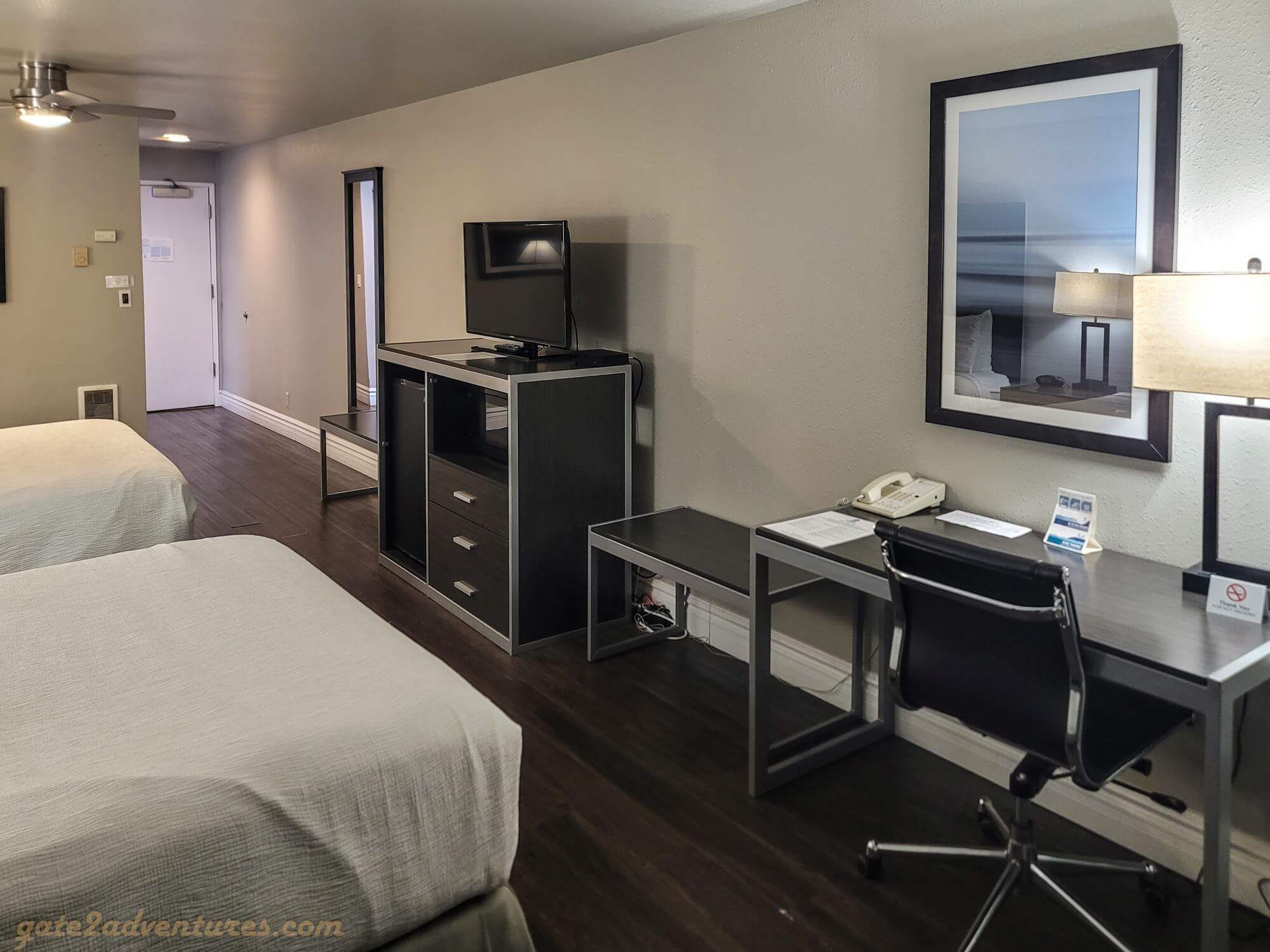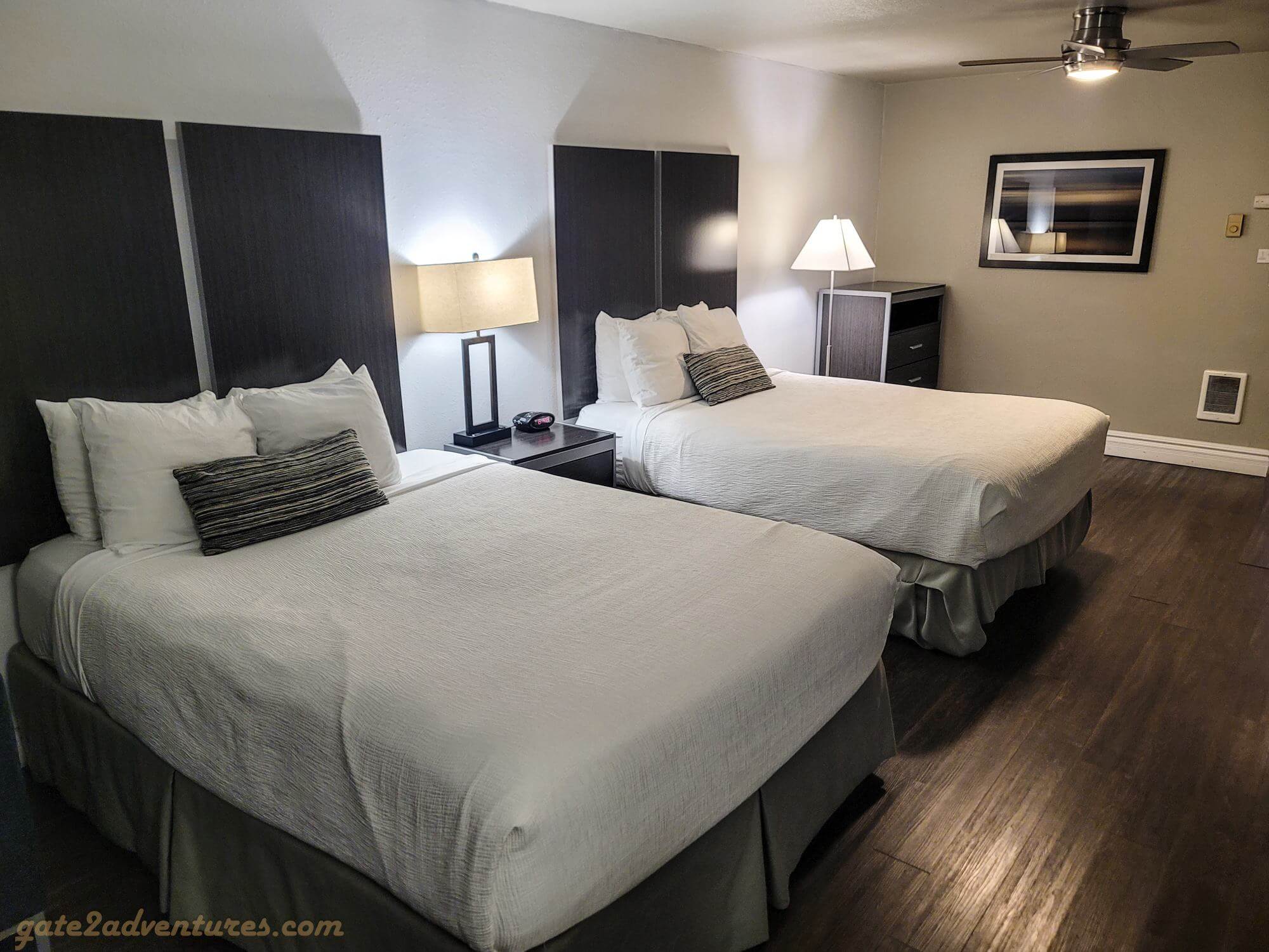 The room is very spacious and had a laminate flooring throughout the room and no carpets. The two Queen beds took up most of one side of the room. A nightstand was placed in the middle of both beds and it had a light on top of it with power outlets. Another power outlet was on the wall between one bed and the dresser which sits in the corner next to the bathroom.
