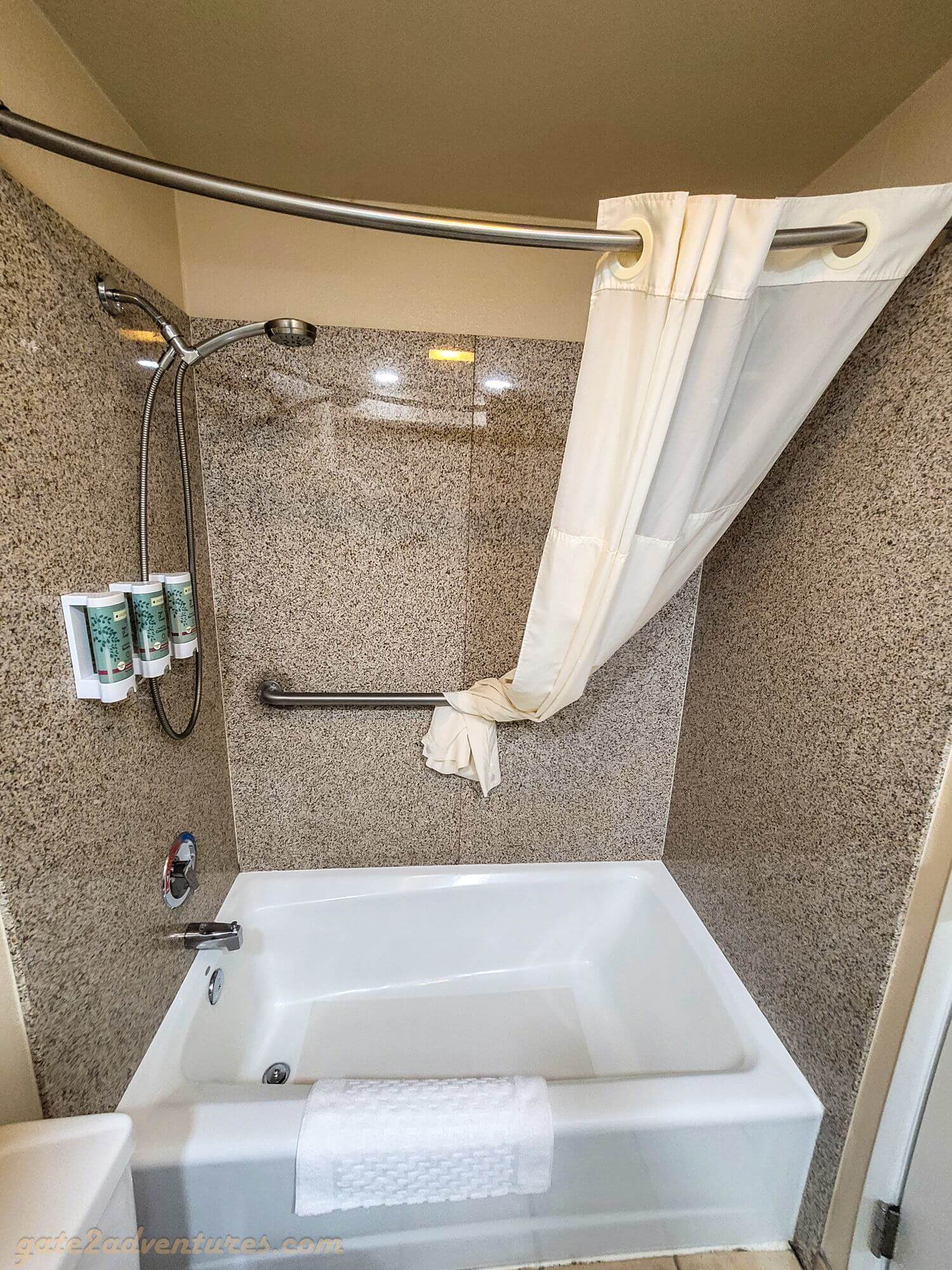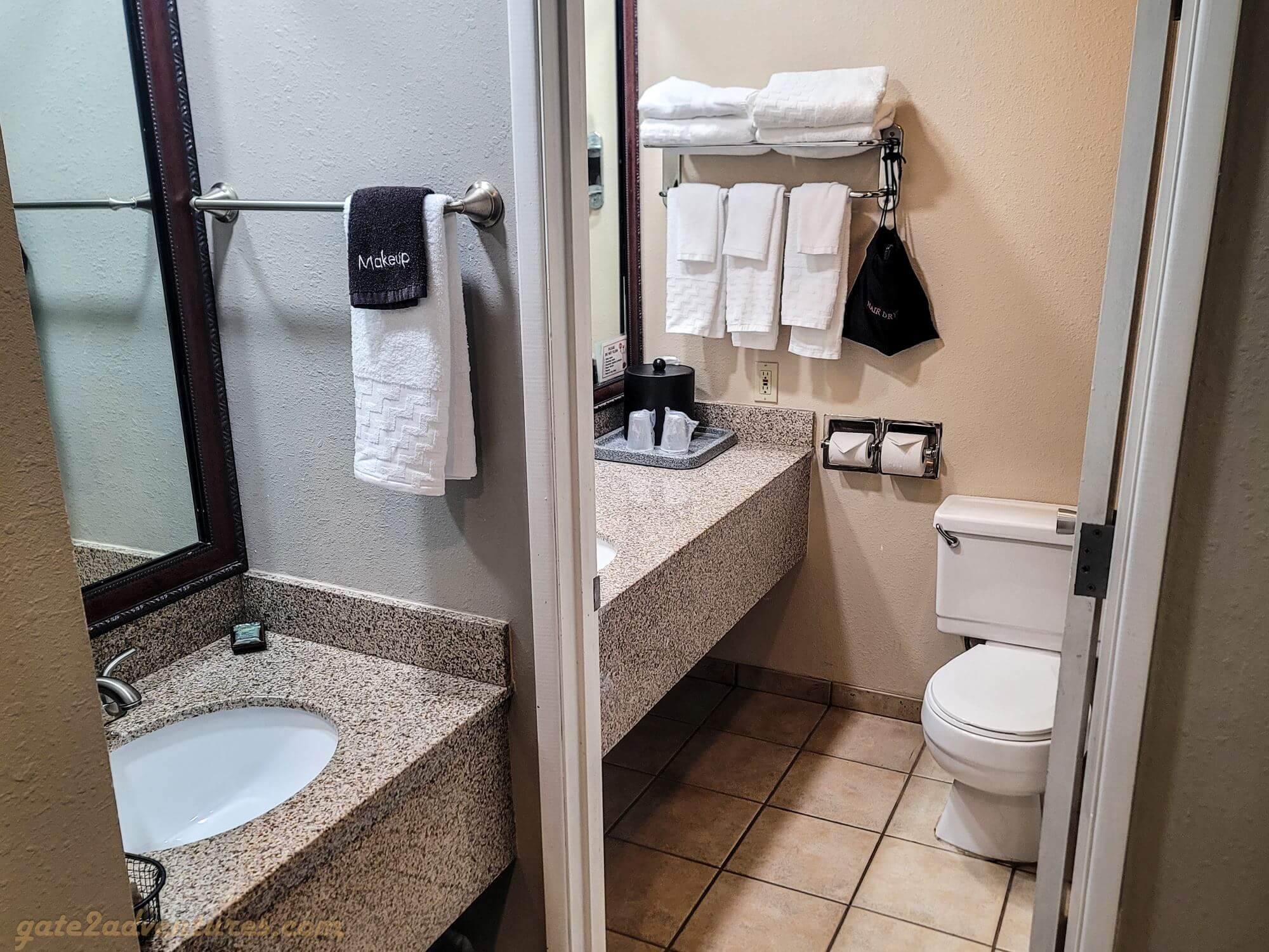 The bathroom itself had a little vestibule which held a small closet and a vanity with a single sink. Inside the closet is a small safe. The main bathroom is rather small. You have to close the door to get into the shower/bathtub combo. The shower comes with a shower wand. Inside the bathroom is another vanity with a single sink, but this one is a little bit wider.