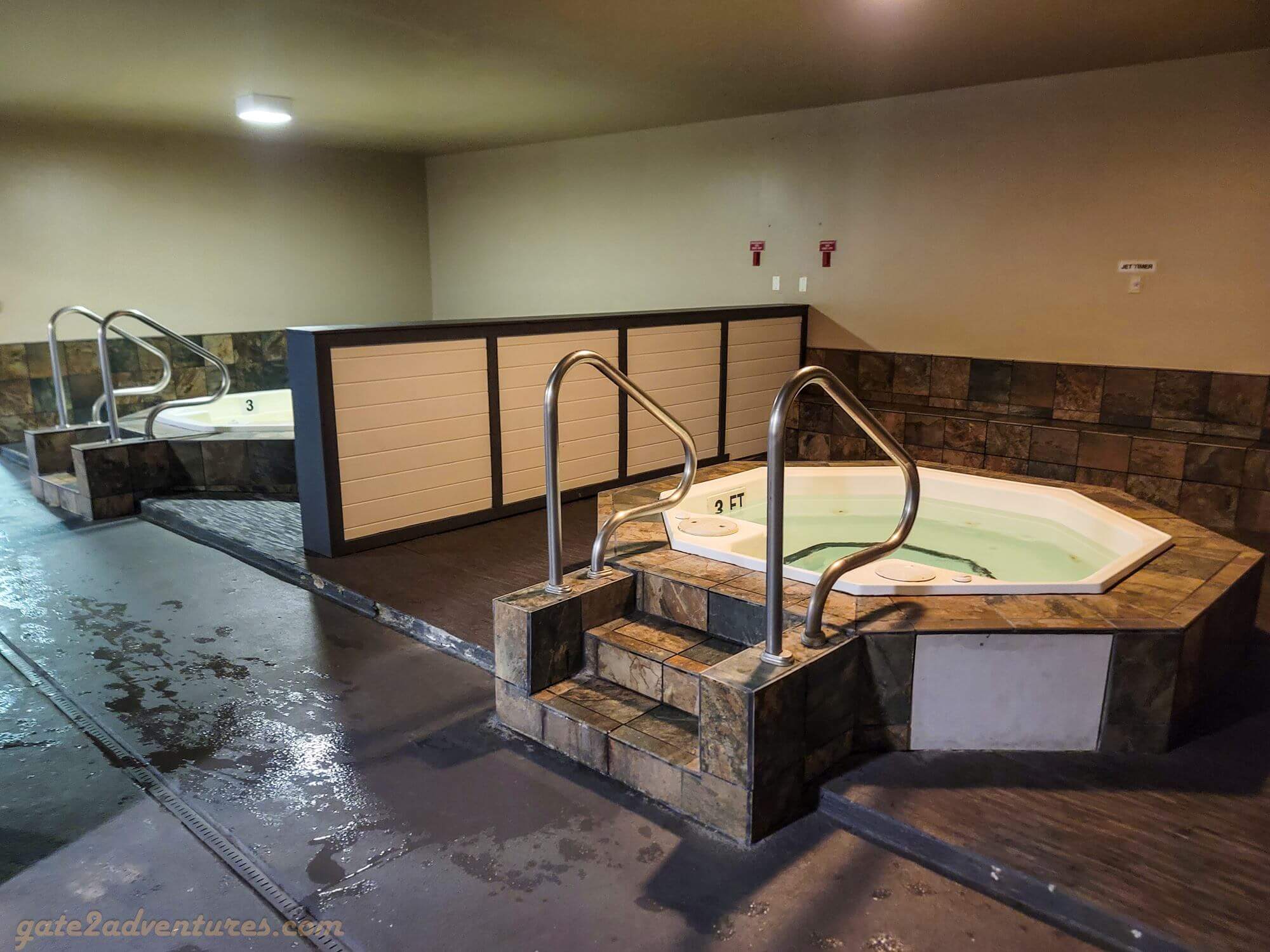 The pool is on the lowest level in the main building. One level below my room. You need your room key to gain access to the pool area. The pool is indoor and is heated. There are also two hot tubs, restroom, shower and a dry sauna. All of that is complimentary for hotel guests. The pool area has large floor to ceiling windows which overlook the river.
