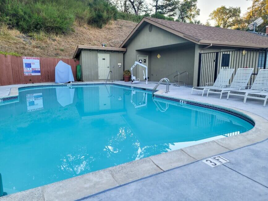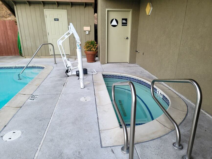 The pool is located outside of the main building with the hotel office. The pool area has a fence running around the perimeter. The door to the pool has a key lock but I don’t know who has the key. You can just take your finger and push the lock open manually from the inside. The pool has a decent size as well as the whirlpool. There are a few pool loungers and some tables with chairs around the pool area. Unfortunately, some people are just idiots and disgusting. Someone was smoking in the hot tub and put their cigarettes just next to the hot tub on the floor and left them there.