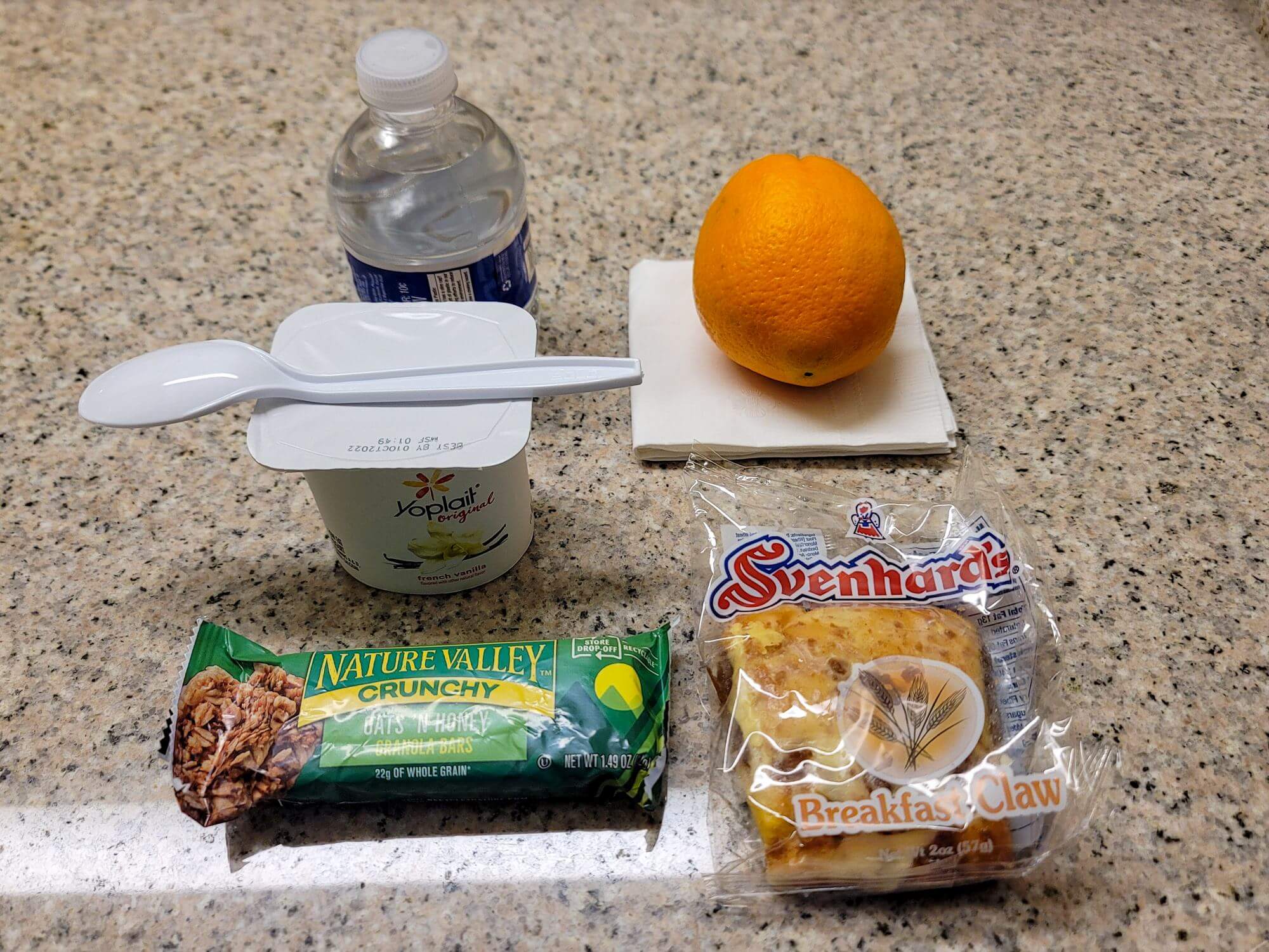 So, what’s in the bag? A small bottle of water, vanilla yoghurt, Nature Valley crunch bar, breakfast claw and an orange.