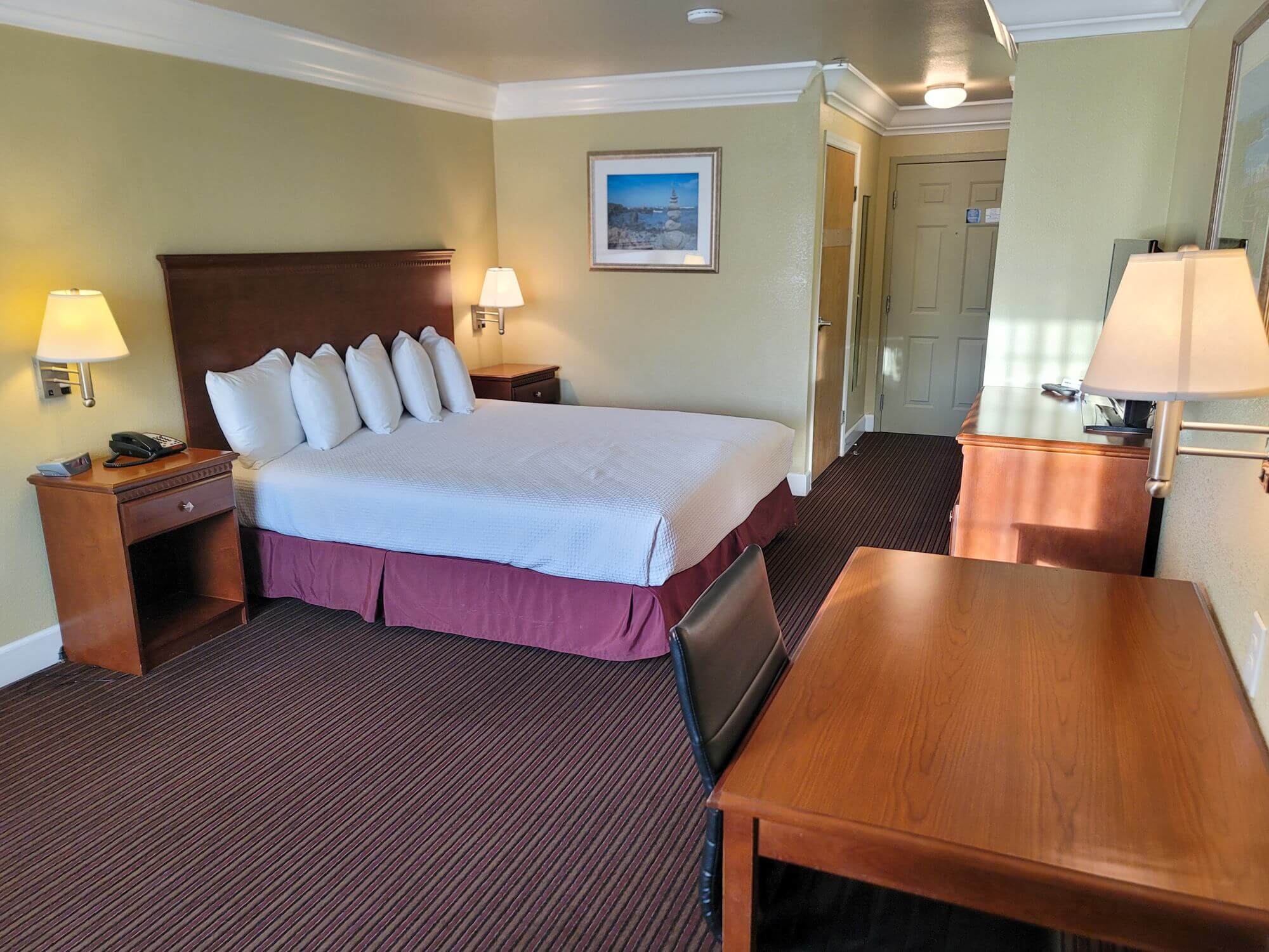 Next to the door is a work desk with an office chair. To the left of the desk is a dresser with multiple drawers and a TV on top of it. Opposite the dresser and TV is the King bed. It comes with a nightstand on either side. There is also a wall-mounted lamp on either side of the bed which also has one power outlet each.