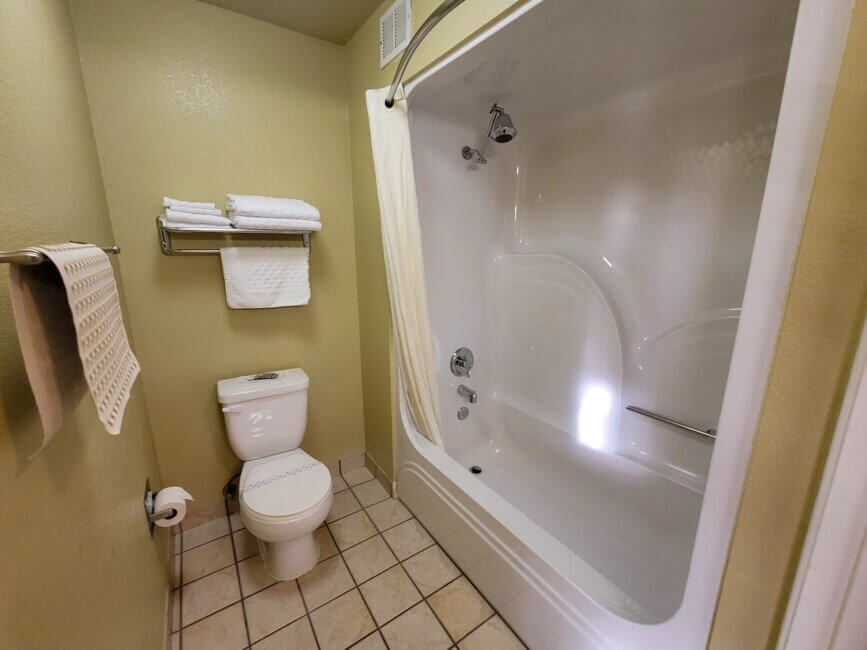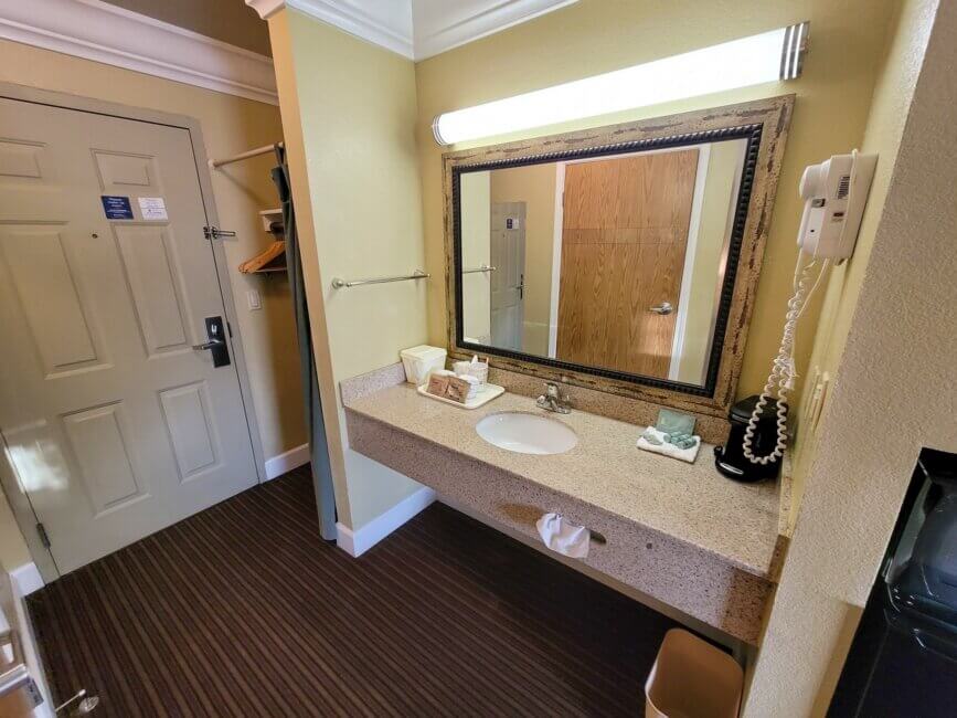 The bathroom is located on the right side of the room, next to the main door. The bathroom is of a decent size and the bathroom door actually opens towards the room and not inside the bathroom. This gives you more space inside as you don’t have to dance around the door. As usual with many motels and Best Western hotels, the bathroom amenities are split. Inside the bathroom are only the toilet and a shower/bathtub combo unit with a shower curtain. The vanity is located right outside the bathroom on the left side of the room. The vanity has a single wash basin and a large wall-mounted mirror. A hair dryer is as well mounted to the wall and the coffee maker sits on top of the counter.