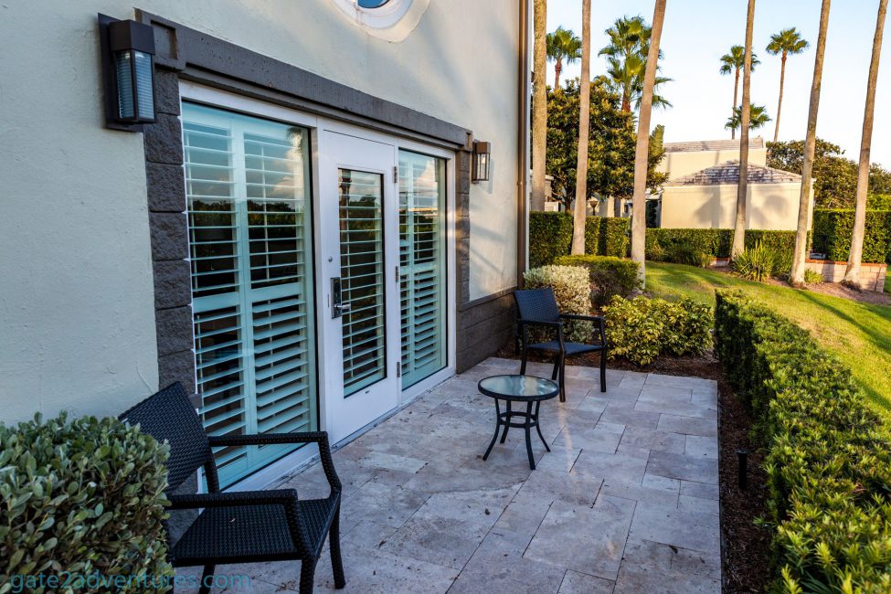 Of course as soon as I arrived in my suite, I had to explore it and of course, I ventured off to the backyard patio. The door closed behind me and as I tried to get back in with my room key, it wouldn’t work. I tried multiple times and I know the key works as I was able to get in from the front door. So I had to walk around the building, past a couple of other patios, to get back to my front door. It makes sense that the door automatically locks behind you, as otherwise, everyone could walk into your room from the back. I was just unfortunate enough to have a door with a dead battery for the door lock. Both doors, the main entrance and the one to the patio are mainly glass. To give you more privacy all of the doors and windows have shutters.
