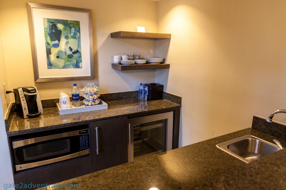 Let’s talk about the suite. The Casita Suite is amazing. It’s a loft-style room. Immediately as you walk into the suite, you have the dining area with the dining table in front of you. The table has for chairs and next to it is a little Kitchenette. The Kitchenette is equipped with regular utensils and dishes to enjoy a meal. The kitchenette comes with a pretty large refrigerator and an additional wine cooler. However, besides a microwave and the coffee maker, there is nothing to even cook a meal yourself. No oven, no pans or anything. But it’s perfect if you ordered room service or takeout from a restaurant. With my world-renowned skills as microwave chef. After enjoying a great meal with the left-overs from a restaurant visit, I was yet to face another problem. After dining I started washing my dishes and silverware in the rather small sink. I found the sponge and dishwashing soap in the drawer next to the sink but how would I dry them? Unfortunately, there are no kitchen towels or paper towels to dry the dishes. I used one of the small towels from the bathroom as my future kitchen towel.