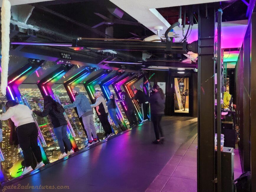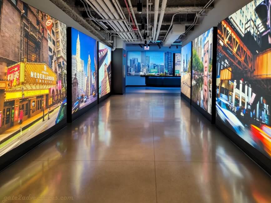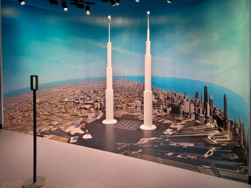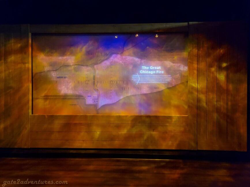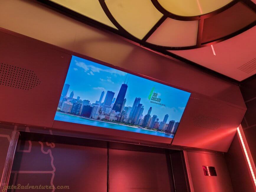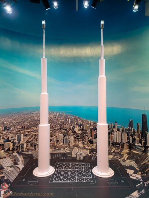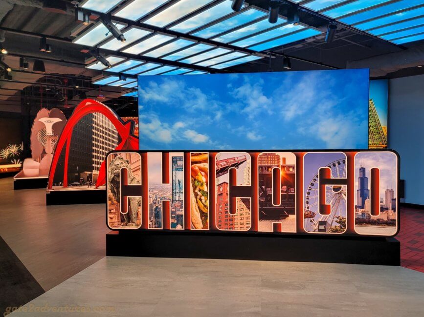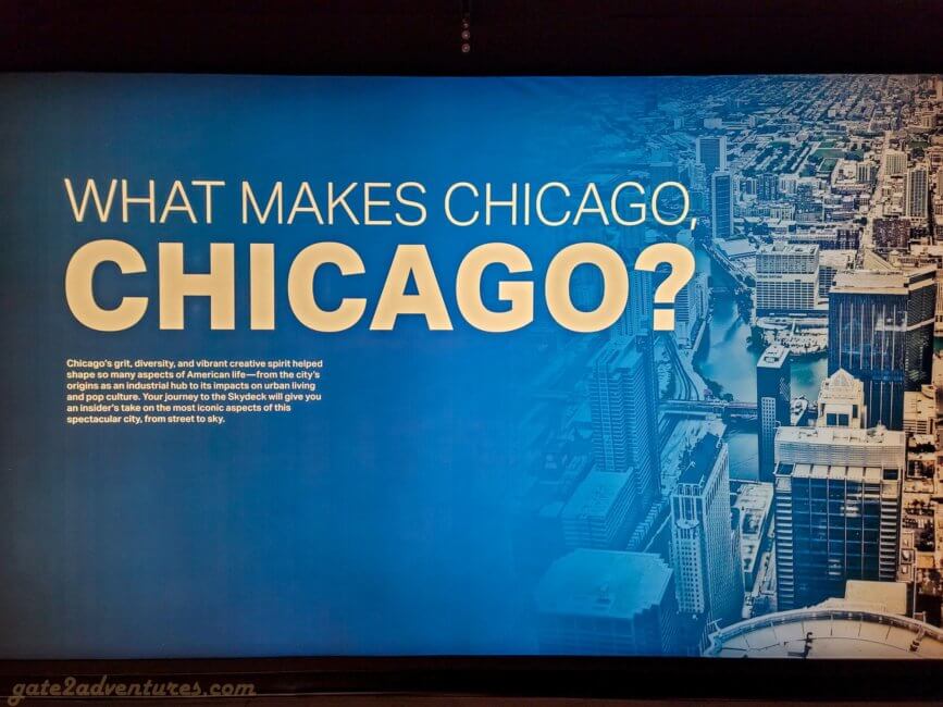 That’s the name of this unique exhibit you will pass through before reaching the elevator. It is a large and very unique exhibit bringing Chicago closer to you. You learn about the history of Chicago, the big fire, famous people from Chicago, Chicago’s food, art & culture as well as the different construction and building styles throughout the city. There are many immersive experiences, like the Chicago Fire exhibit or a walk through one of the L-Trains (elevated trains) which run in Chicago. Before each immersive experience, there is a bypass door for this experience. It’s well-marked, just keep a lookout for the signs in case you have trouble with light shows and such. You can spend easily an hour here, probably more, exploring all the exhibits and taking pictures.