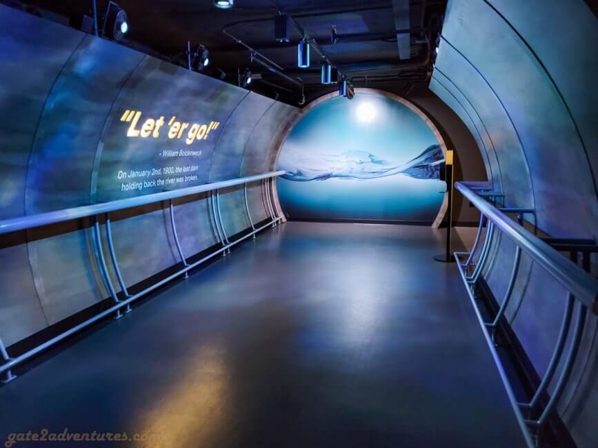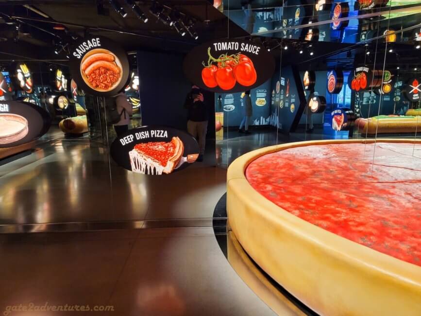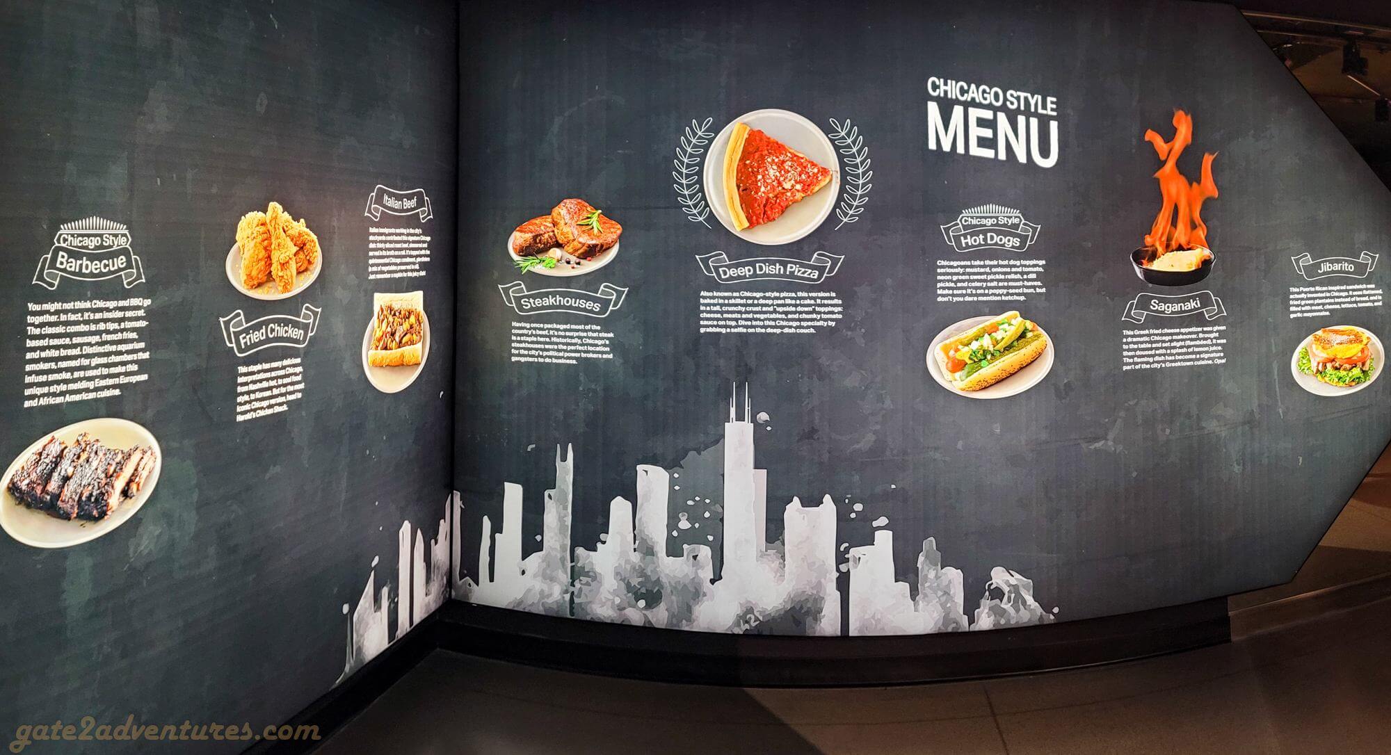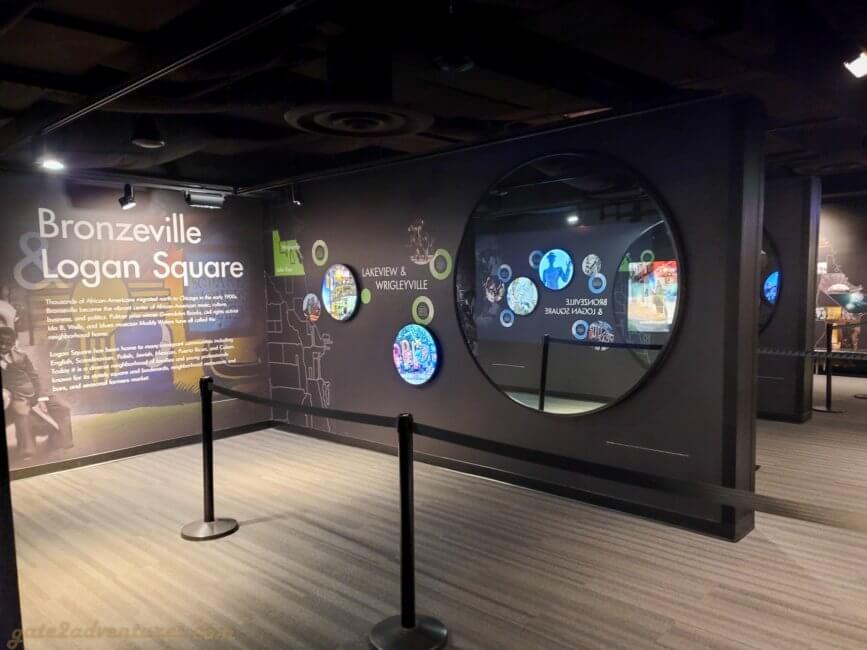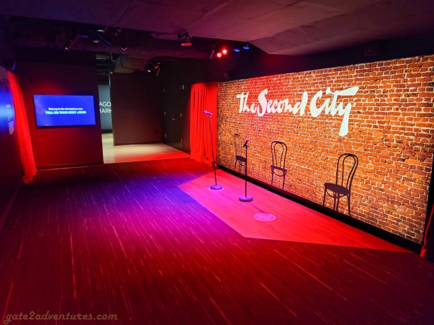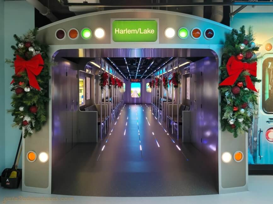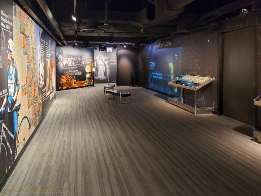 That’s the name of this unique exhibit you will pass through before reaching the elevator. It is a large and very unique exhibit bringing Chicago closer to you. You learn about the history of Chicago, the big fire, famous people from Chicago, Chicago’s food, art & culture as well as the different construction and building styles throughout the city. There are many immersive experiences, like the Chicago Fire exhibit or a walk through one of the L-Trains (elevated trains) which run in Chicago. Before each immersive experience, there is a bypass door for this experience. It’s well-marked, just keep a lookout for the signs in case you have trouble with light shows and such. You can spend easily an hour here, probably more, exploring all the exhibits and taking pictures.