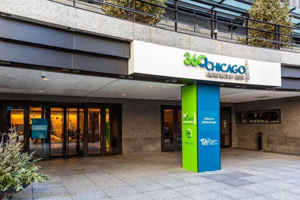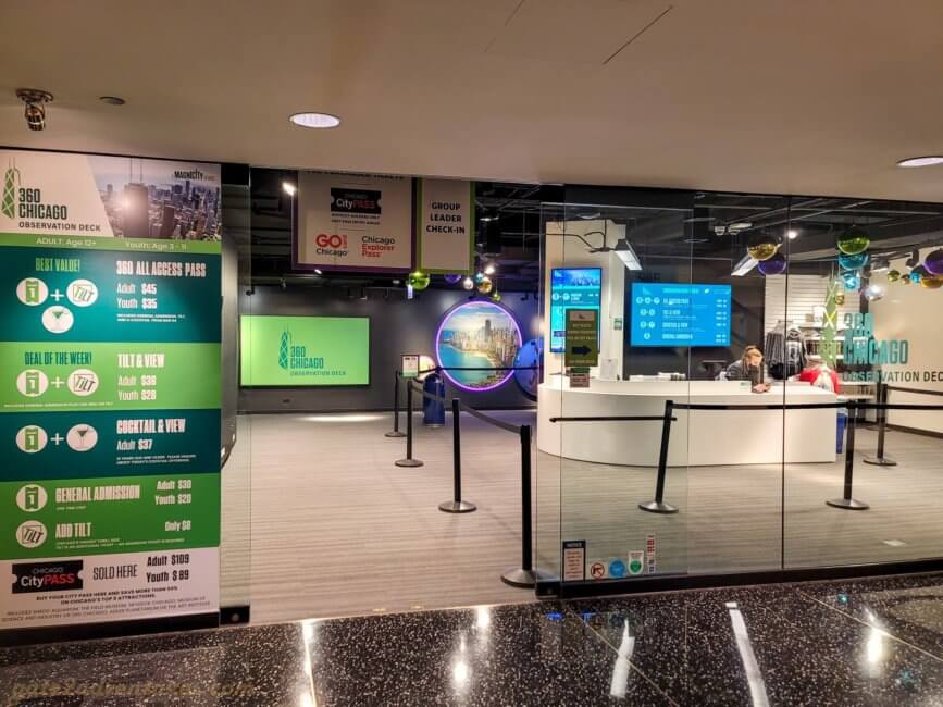 The 360 Chicago Observation Deck is located inside the former John Hancock Center at 875 N Michigan Avenue. It is the fourth tallest building in Chicago. At the top of Chicago’s Magnificient Mile, the best shopping experience in town. Parking is limited to parking garages and some street parking. The building has its own parking garage, but be prepared to pay for this convenience. I recommend you to get there via public transportation, ride share or by walking if you stay somewhere in town. The entrance is off N Michigan Avenue. Once at the building take the stairs down to the lower plaza level and use the entrance next to the Cheesecake Factory. Yes, you have to go down first to go up. 😉 Don’t worry, you can’t miss it, there are plenty of signs of how to get there. Once inside keep to your left and you will see the ticket counter in front of you.