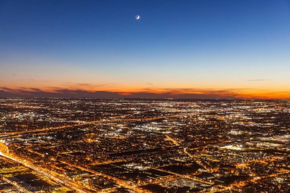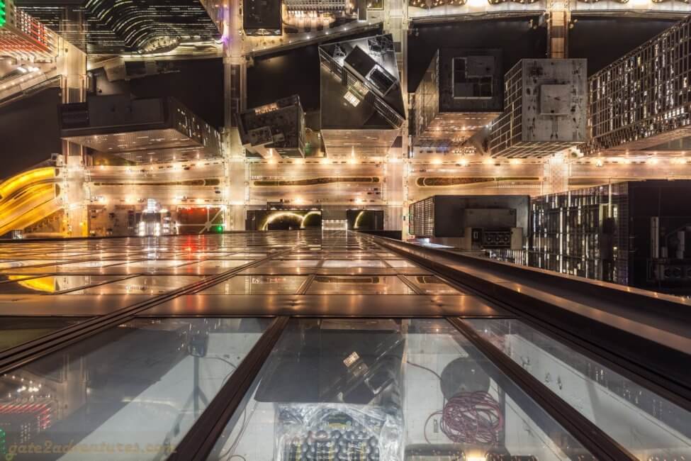 However, I was in a rush as I wanted to get up to the Skydeck before sunset. I rushed through the Skydeck experience and used all the bypass doors. Please be careful opening the doors, as the last door drops you out in front of the elevator where usually people are waiting in line and of course not keeping clear of doors. I slightly slammed the door on a guy, standing too close to it as I was rushing for the elevator. So far I was well in time to make it for sunset, but the line for the elevator killed my plans. Even though that I barely saw a soul throughout the Skydeck experience, the line for the elevator was long and it took me over 30 minutes to get on the elevator. Good-bye sunset. Maybe next time. At least I was able to capture pictures throughout the blue hour. Yes, I also skipped the amazing Skydeck experience, but don’t worry. You can revisit the experience after you come down from the Skydeck. Go straight ahead and use the center hallway. This is actually the expedited entry lane but you can take it back out and it brings you right to the beginning of the Skydeck Experience. Don’t worry about the gate, it will open automatically as you get close. The lane could be busy with waiting people who hold expedited entry tickets but that’s the way the agent operating the elevator told me.