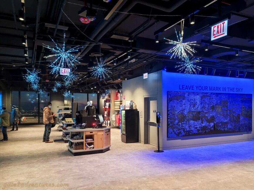 There are restrooms at the observation deck as well as a bar. If you bought an All-Access pass, be aware that the actual menu for your free drink is different from what their main menu is. The bartender will let you know what is actually included with your pass. Otherwise, you can buy whatever you want. they even have some small snacks. The gift shop offers the usual gifts you would expect. Maybe worth checking out.