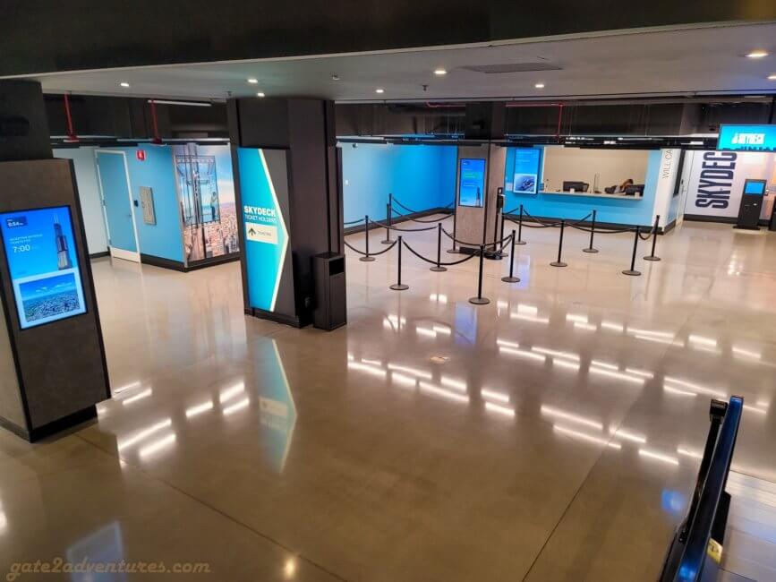 Skydeck Chicago is located at 233 S Wacker Dr, Chicago, IL 60606. To get to the Skydeck enter the building through the main entrance on Wacker Dr. There are signs pointing you towards the entrance. However, I wasn’t sure if I am supposed to take the main entrance or if there is a side entrance just for tourists going to the Skydeck. But no, you have to use the main entrance of the building. Just walk along the side of the building next to Wacker Drive and you can’t miss the entrance. Once inside, keep right and follow the stairs down. Signs will point you to the Skydeck entrance.