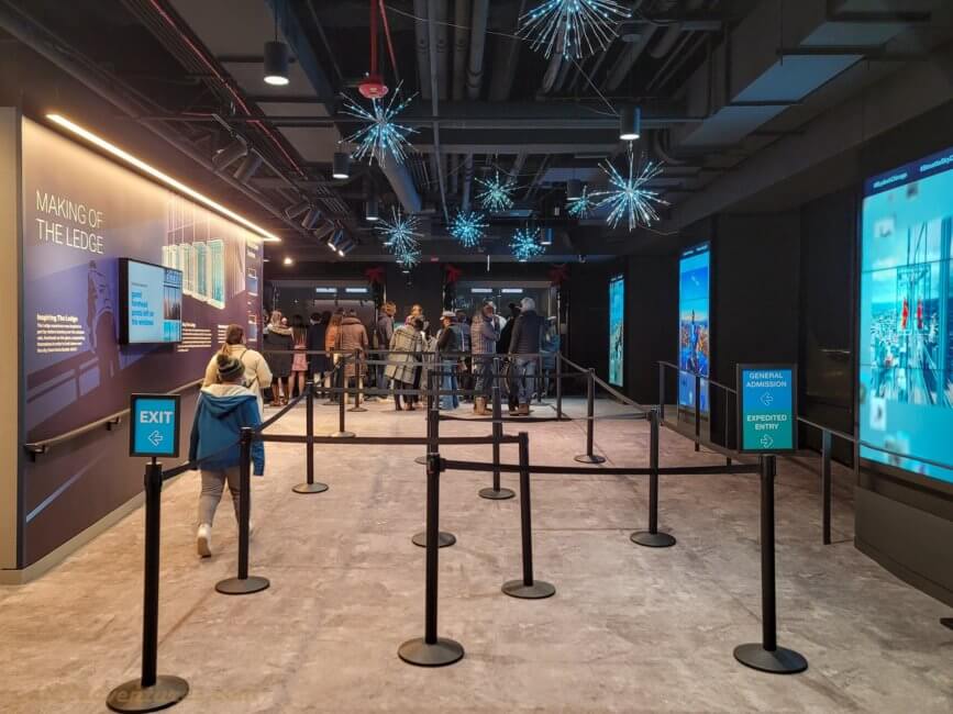 This experience is unique to the Skydeck. There are currently four “ledges” and a fifth one is under construction. There is a line for general admission ticket holders and expedited entry holders. Don’t worry, nobody can cheat, as they will scan the tickets of people in the expedited entry lane. Depending on how busy it is, wait times can be quite long. The Ledge experience is included with every admission. No extra ticket is necessary. Even when you buy a Chicago City Pass, the Ledge is included in the price.