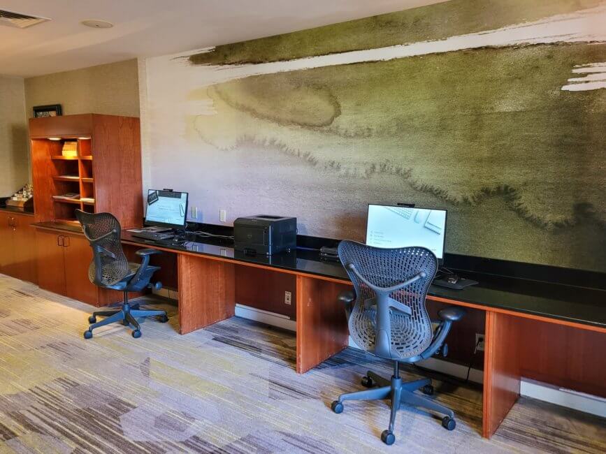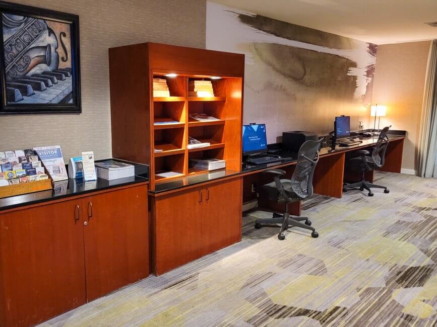 The business center consists of two workstations along a wall. There is plenty of spacing between the workstations. Both workstations share one printer. On the counter near the business center, you can find flyers with tourist information and some magazines.