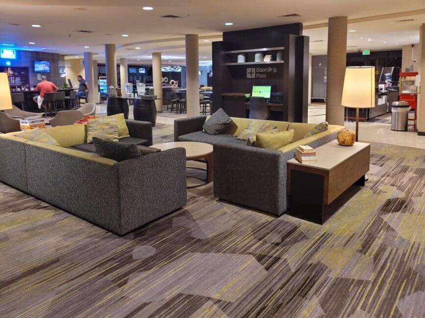 The lobby is very spacious and has lots of spots to sit and hang out. There are plenty of chairs and sofas throughout the lobby to sit down. The lobby area also houses the breakfast area and a bar. The lounge chairs facing a TV remind me of what you find at American Express Centurion Lounges.