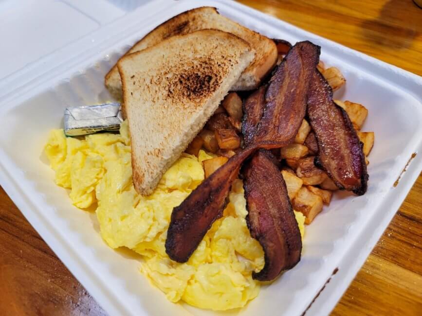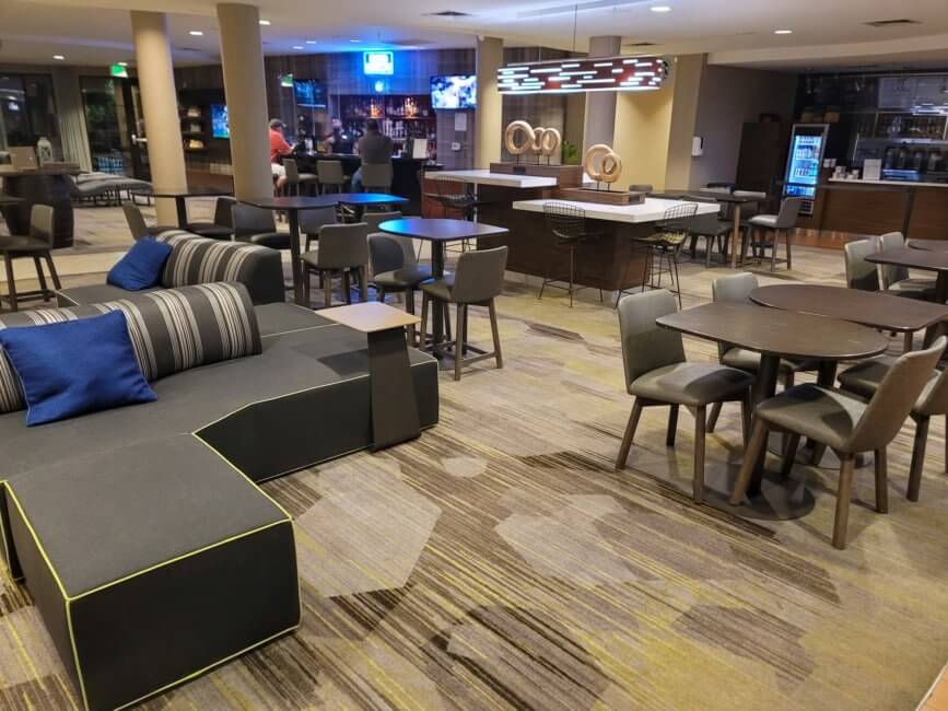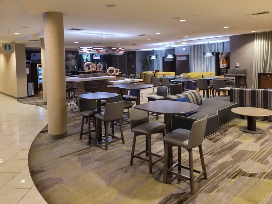 The breakfast here is the typical Marriott Courtyard setup. You get your Starbucks coffee and have a small menu to order from for breakfast. It’s better than a Starbucks, as you can get at least an “eggs your way” plate at the hotel. That’s what I ordered and it’s a well-proportioned size. However, breakfast is not included in your room rate. Everything is an additional charge. Breakfast is served daily from 6 a.m. until 10 a.m.