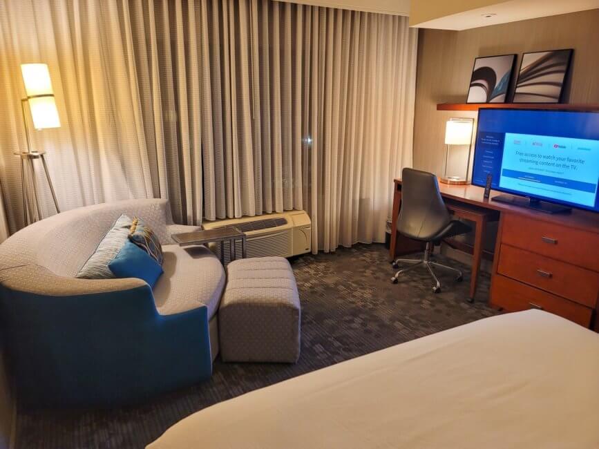 On the opposite wall is a cozy sofa with an ottoman and a laptop table. The sofa can be transformed into an additional bed. Between the sofa and the office desk is a window. The view is nothing special. You have a view of the parking lot and the nearby motel. Right under the window is the air conditioning unit. With its location and the location of the desk, you get air blown on you when the unit is working.
