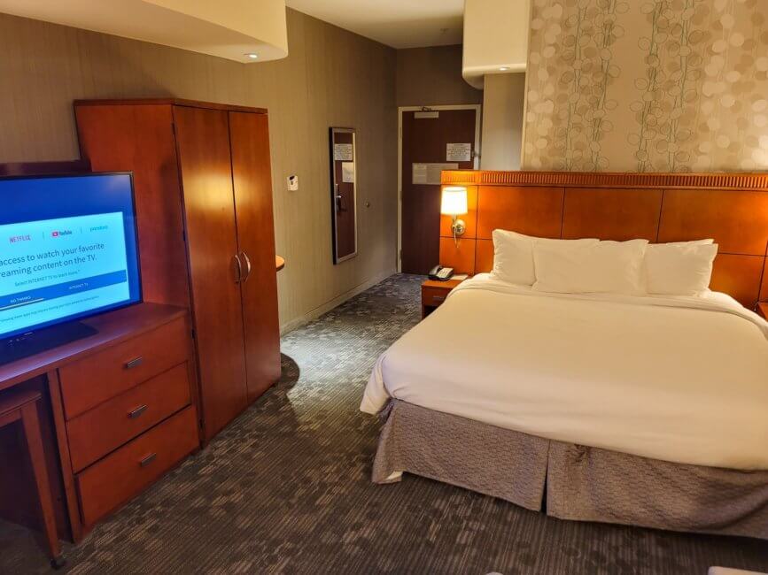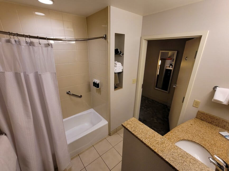 The room is located at the end of the hallway, but close to a second elevator. This elevator is close to the back entrance of the hotel. As you walk in, you have the bathroom on your left. It’s separated by a door from the rest of the room. On the left is your vanity with a single sink and a wall-mounted mirror. Next to it is the toilet. On the other side of the bathroom is the bathtub/shower combination. Inside the shower are three wall-mounted dispensers for the shampoos. On the wall of the entryway is a dressing mirror.