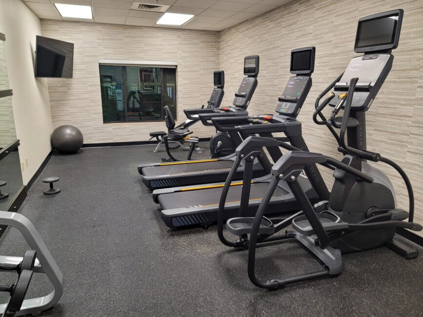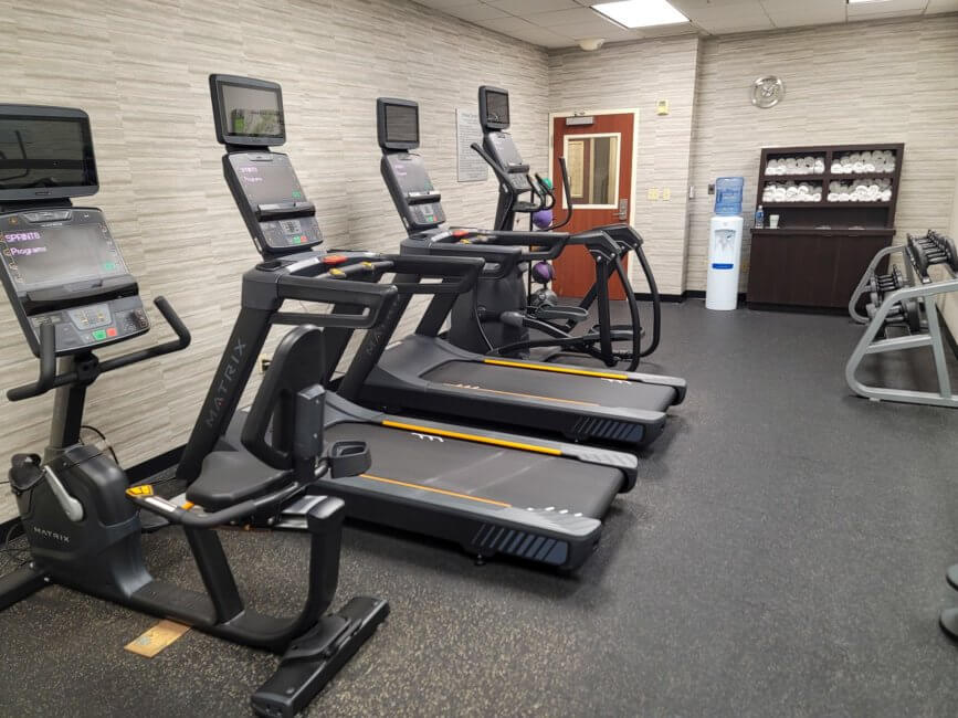 The fitness center is located down the left hallway. It’s about halfway down on your right-hand side. It’s a small fitness center but has a good selection of workout equipment. The window of the fitness center faces toward the outdoor swimming pool.