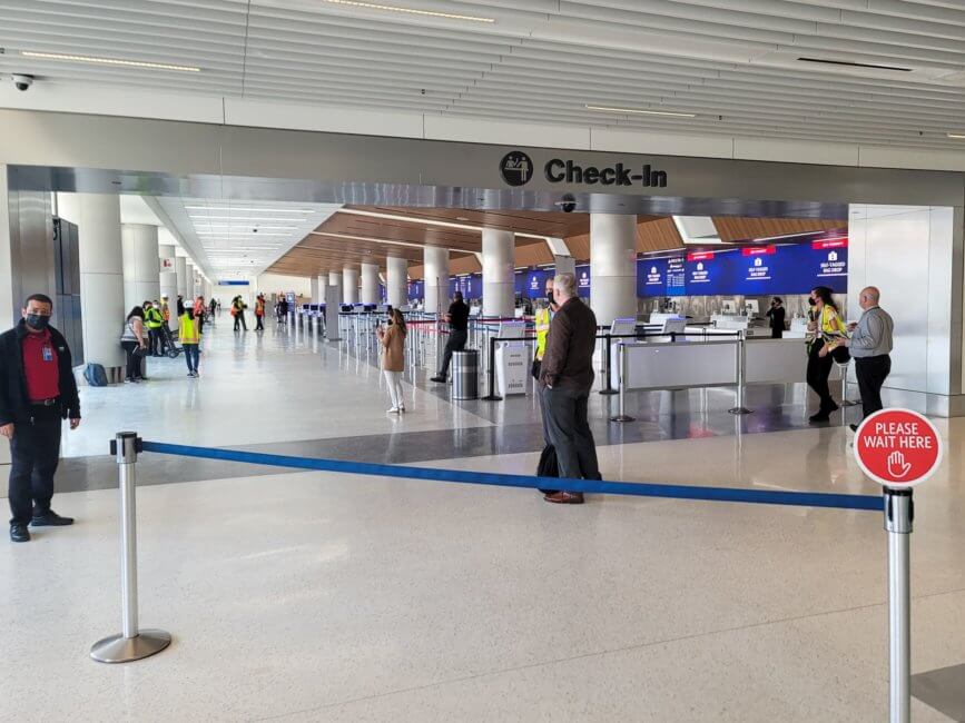 If I counted correctly, you will find 32 self-serve kiosks and 46 staffed check-in counters. A digital back wall spans the entire back of the check-in area. There will be separate areas for SkyPriority, Agent Assist, and bag drop. Everything is clearly marked with signs and on the digital back wall. The digital back wall shows most of the information in English and Spanish.