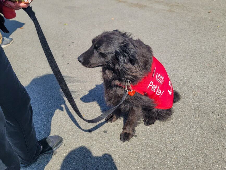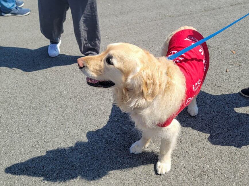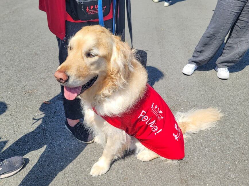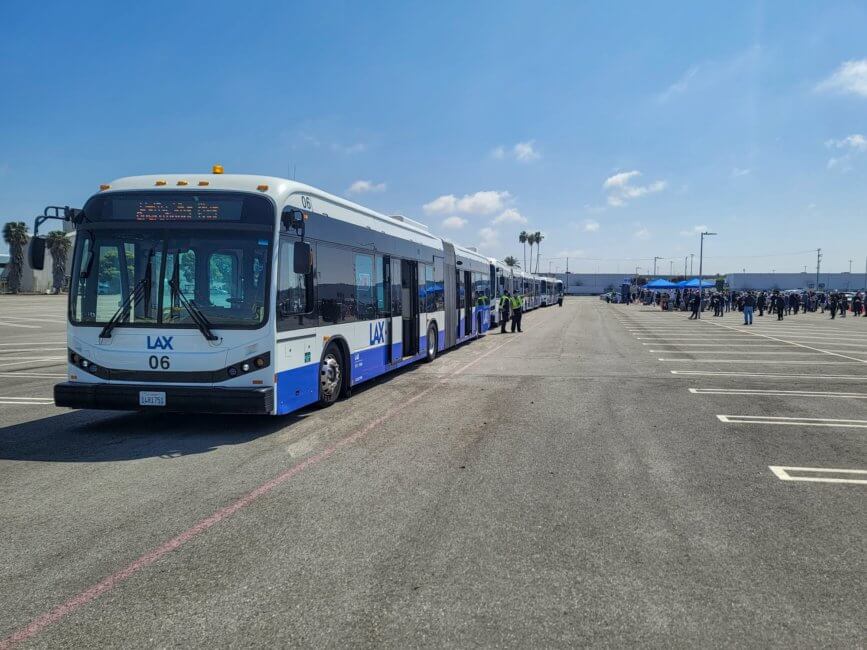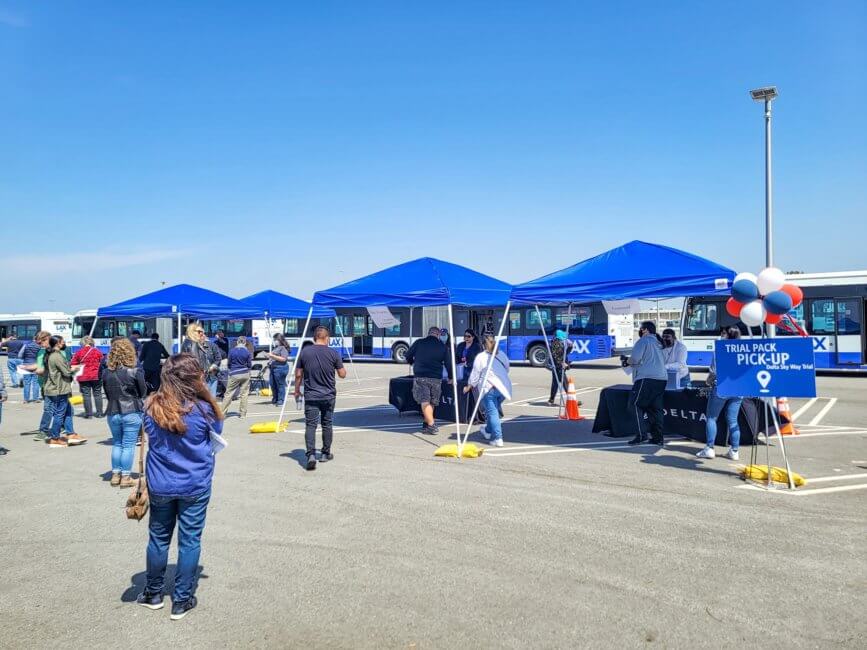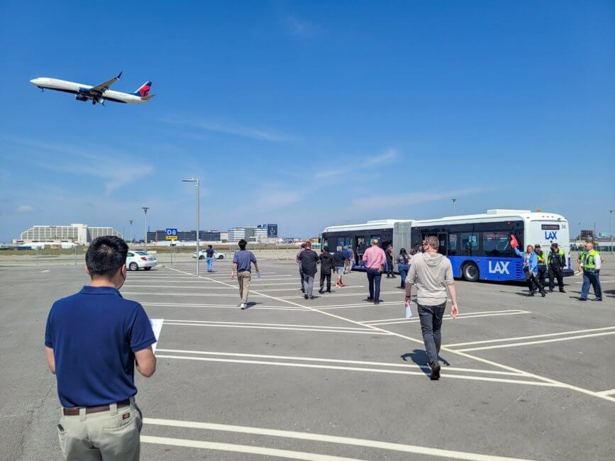 The check-in location was a parking lot near the aviation-themed restaurant “Proud Bird” at the south-eastern corner of the airport. Snacks and water was supplied while we waited for the busses to take us to the airport to begin our trial. While waiting to board the busses, participants in the trial were able to meet dogs from the LAX Pets Unstressing Passengers (PUP) program. These dogs are around the airport to provide stress relief and comfort to passengers through interactions. These pets are the volunteers who “own” dogs and both donate time to LAX. There were three out at the meeting location for the trial and the cutest one was for sure Murphy, a golden retriever with the nickname “Murph the Smurf”. More information about the PUP program is available at www.lawa.org/pup. There are quite a few of them listed on the website but I can’t recall ever seeing one in the terminal roaming around.