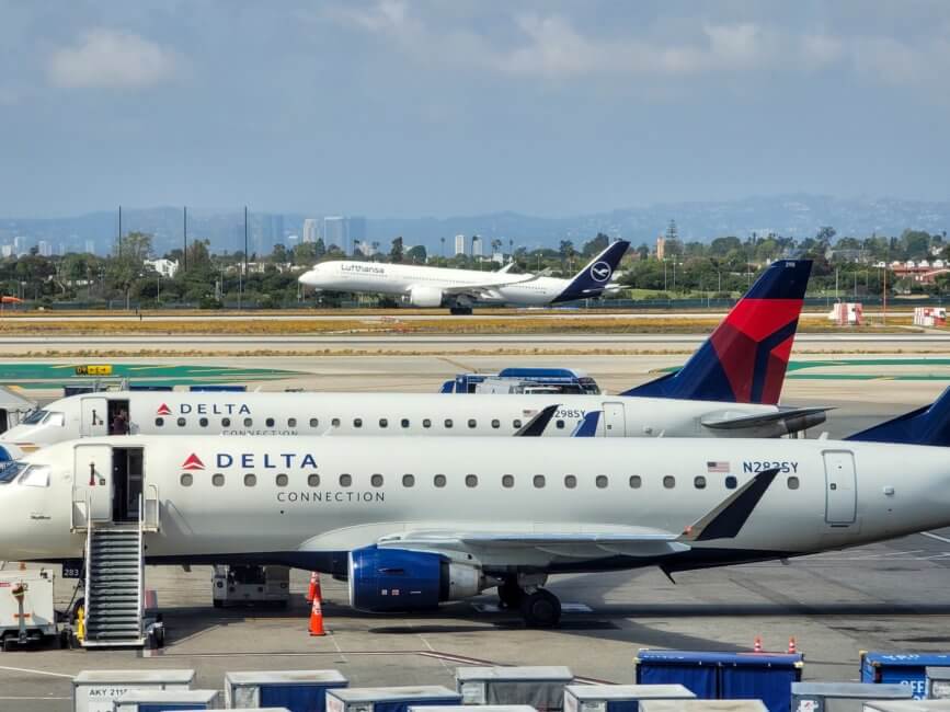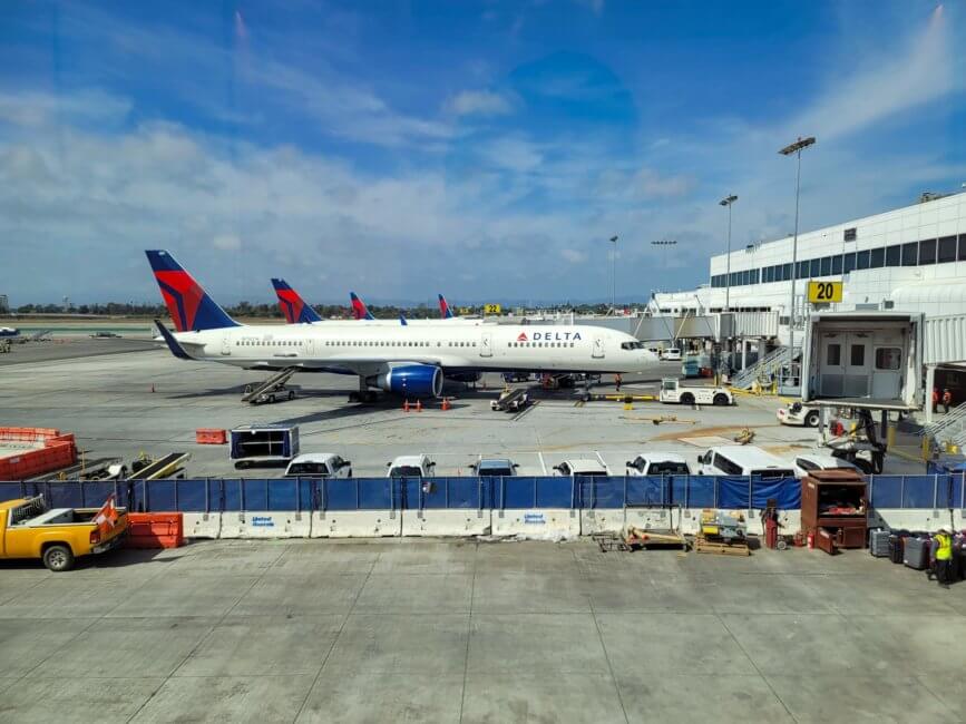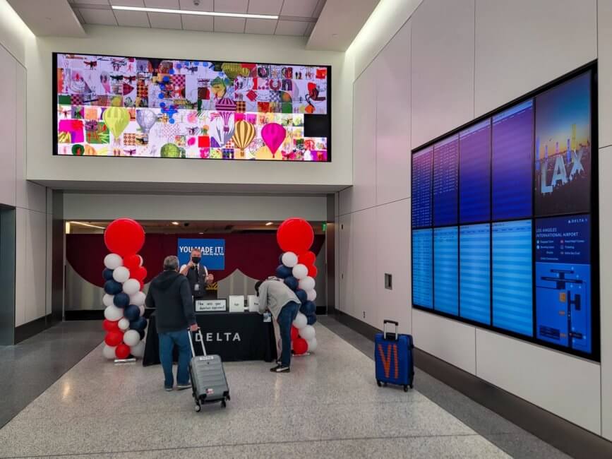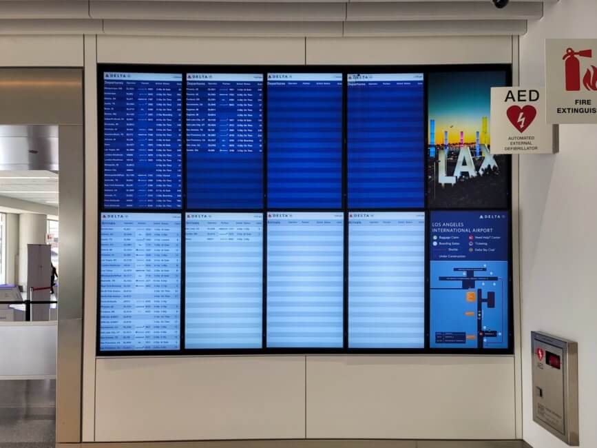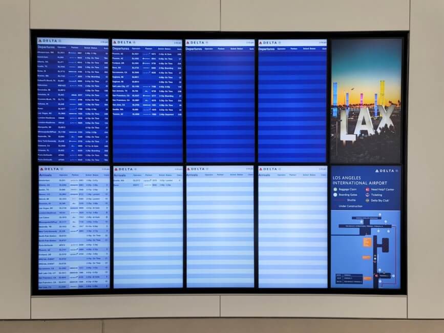 Once you are through security large windows will offer a great view of Delta’s operation at Terminals 2 and 3 and aviation geeks can enjoy the view of planes making their way to and from gates as well get a view of the northern runways with the Hollywood Hills in the background. Right past the security checkpoint is also a flight information board with up-to-date information about departing Delta flights.