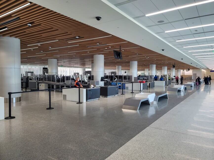 14 security lines will allow for a bigger passenger throughput and shorter waiting times at the security checkpoint. 11 of the 14 security lines will be Automated Screening Lanes. Seven of the security lanes will be open when the facility opens on April 20, 2022. The remaining seven will be operational by late Summer 2022.