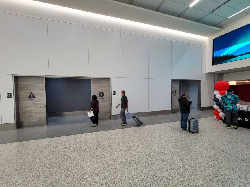 There is a restroom right before the Headhouse connects to Terminal 2. It’s a rather small restroom but features all touchless sinks. Labeling was only on the outside of the entrance and when you are not careful you walk in the wrong direction inside and accidentally go to the wrong restroom. This happened to a few passengers during the trial. However, I don’t know what their travel experience level was. Close to the entrance of the regular restrooms is also an All Gender Restroom.