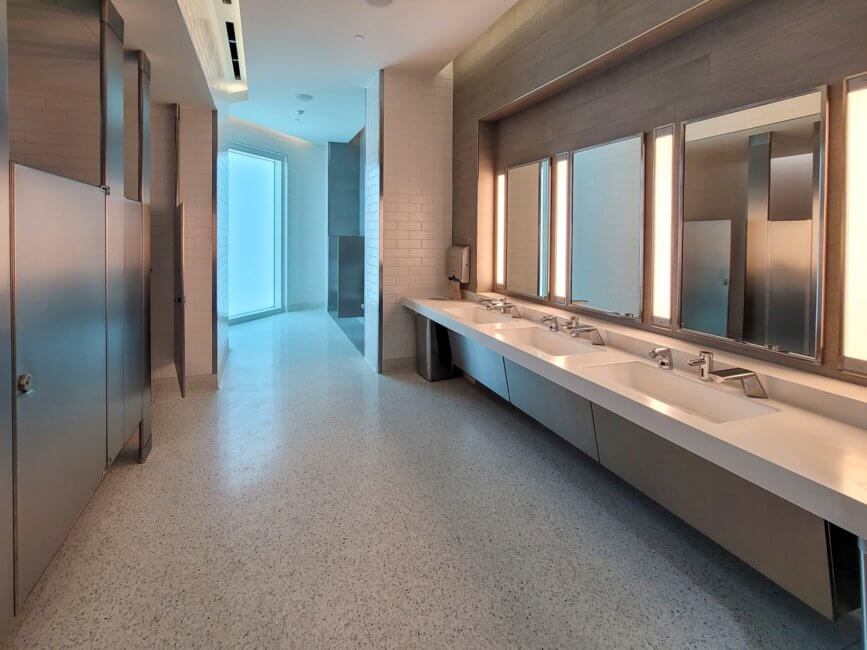 Bigger restroom facilities are located in the check-in hall. All of these restrooms are modern and feature touchless sinks.
