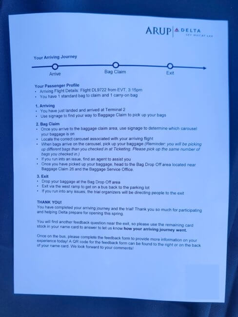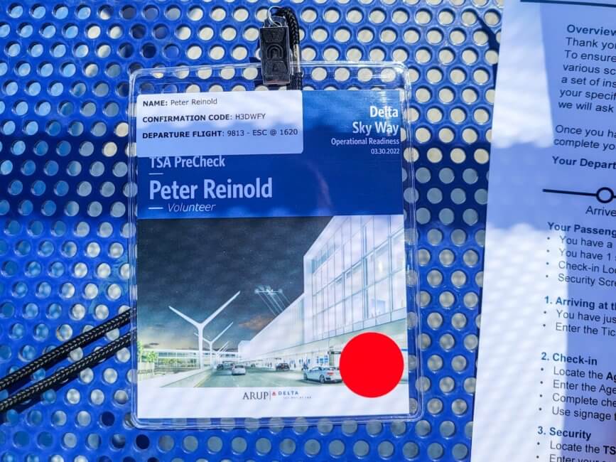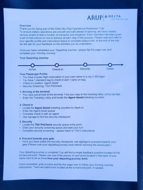 I got a sneak peek of the new Sky Way Headhouse during a trial run on Wednesday, one day after the ribbon-cutting ceremony, which I missed because of my work schedule. If you are not familiar with what a trial is, it is a way for Delta to test the new facility before opening to the public. Volunteers are invited to act as passengers at the new facility. Everyone gets a script which they have to follow on what to do. This script details your traveler profile like if you are checking bags, or how you will be checking in at the terminal, as well if you have TSA pre-check or just regular security screening. It goes on and on. Below you can see my script and passenger profile.