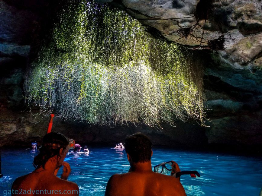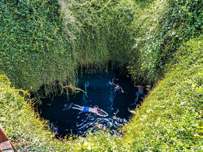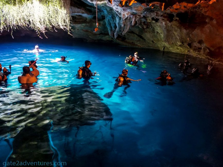 When you arrive you have to check-in at the office and signed an insurance liability waiver. After that, you are allowed to enter the cave only as a snorkeler or scuba diver. As a snorkeler, you need at least a mask, snorkel, and fins. You can rent snorkeling and scuba gear on-site if you haven’t brought your own. The entrance to the cave is very small. Let other people first exit before you head down.
