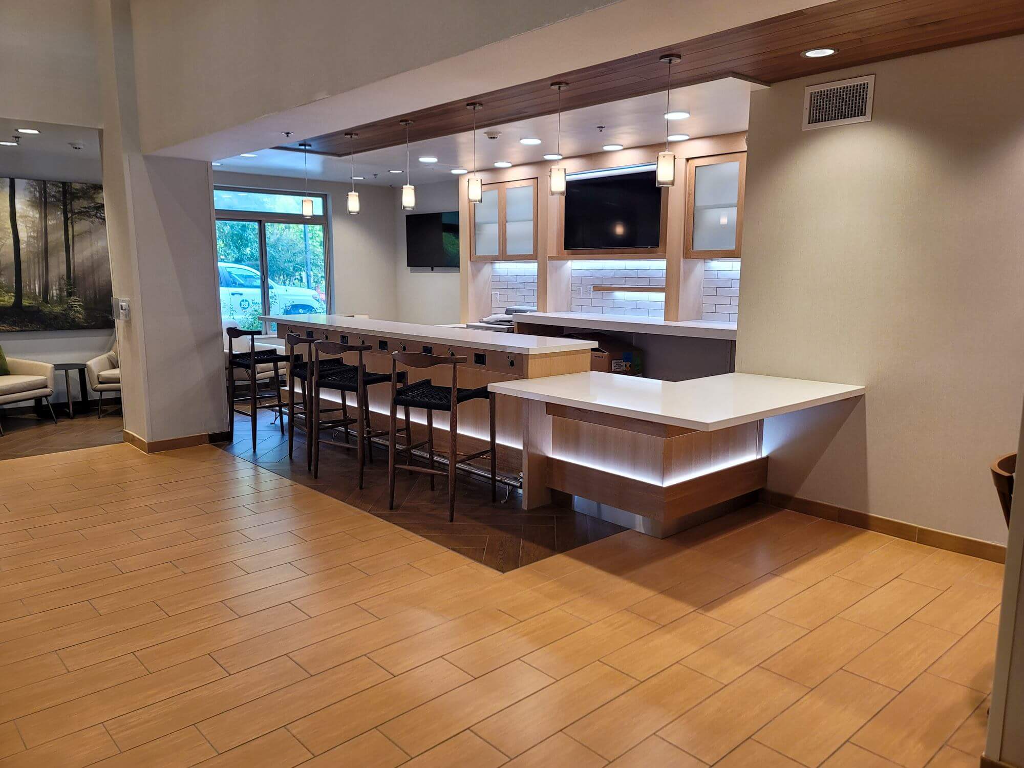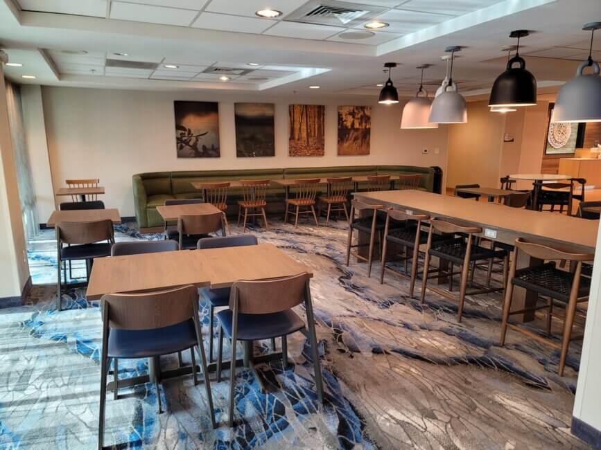 The lobby was renovated as well and now features a bar area opposite the front desk. Other than that, the lobby consists of the dining space for breakfast with lots of dining tables. There are a few chairs in the main lobby by the front desk.